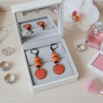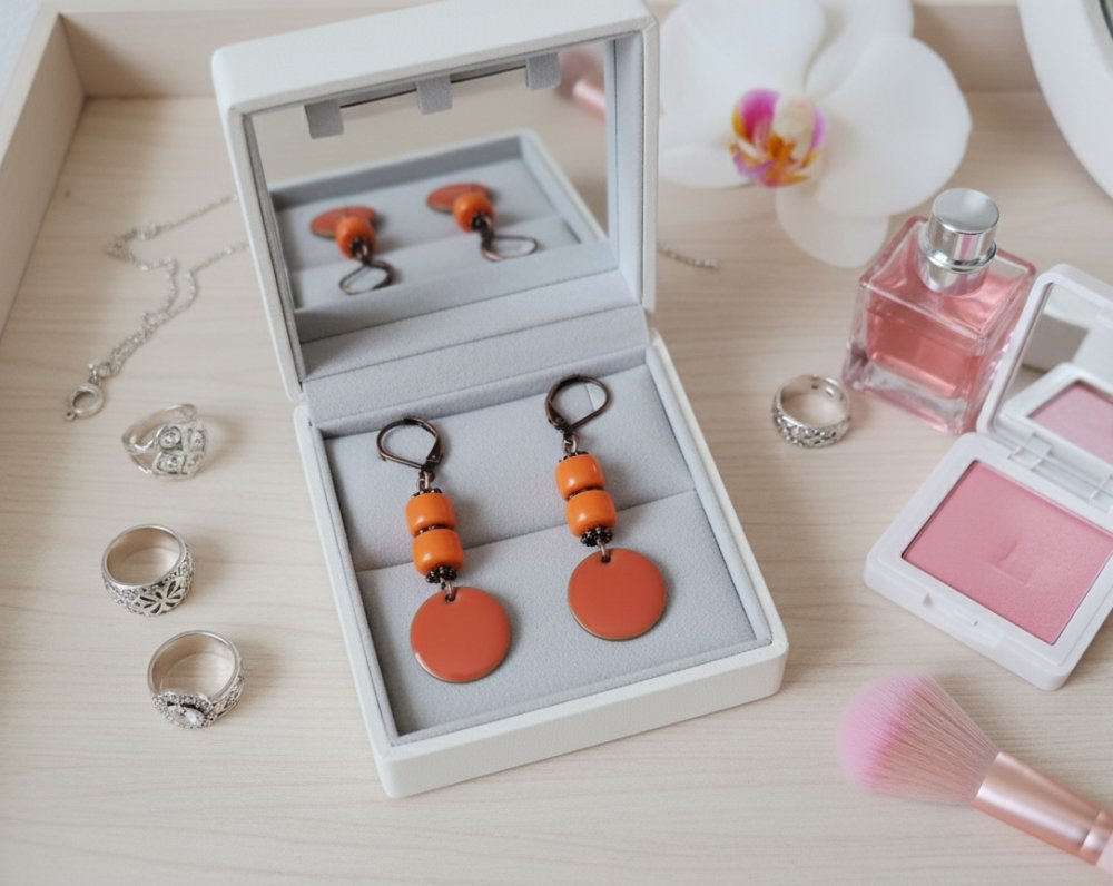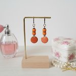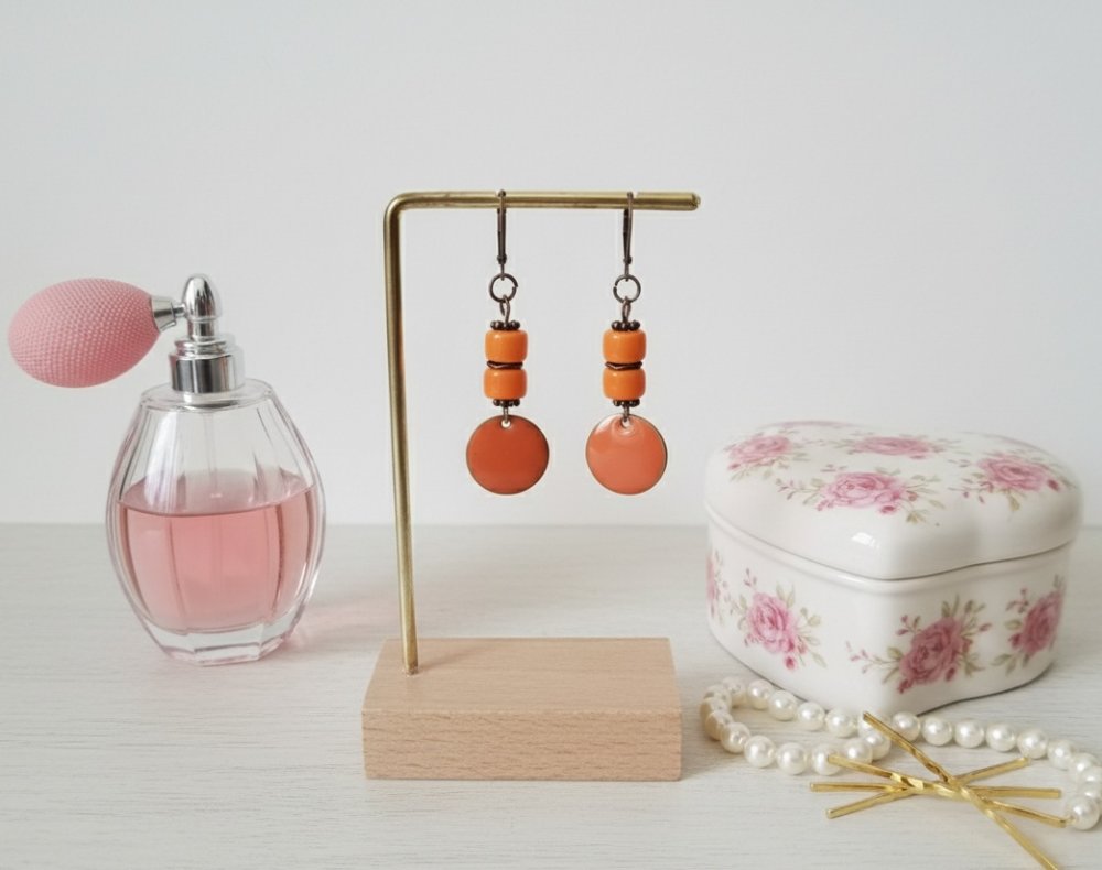 Boucles d'oreilles pendantes avec pendentif rond en émail, perles en verre colonne et apprêts de couleur cuivre rouge