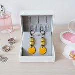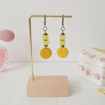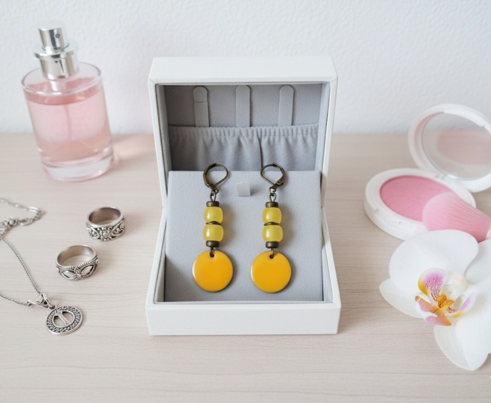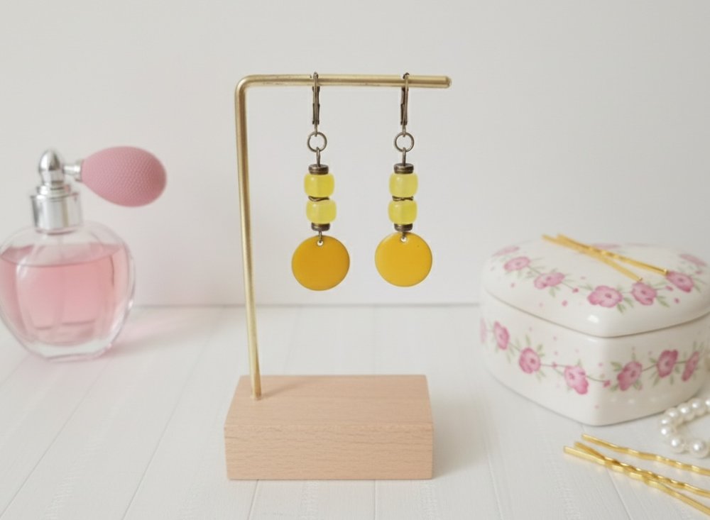 Boucles d'oreilles pendantes avec pendentif rond en émail, perles en verre colonne et apprêts de couleur bronze