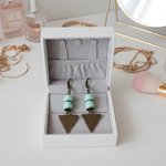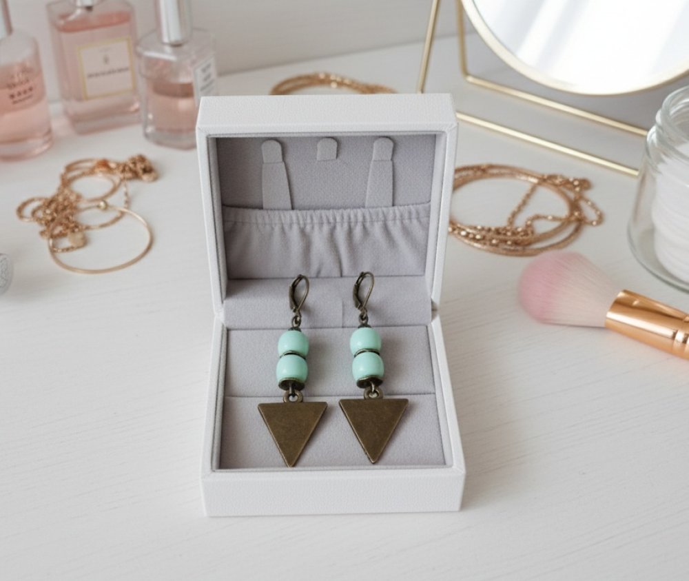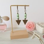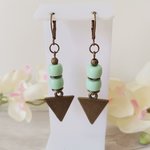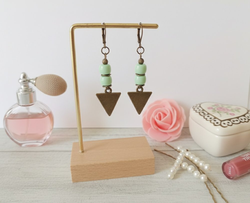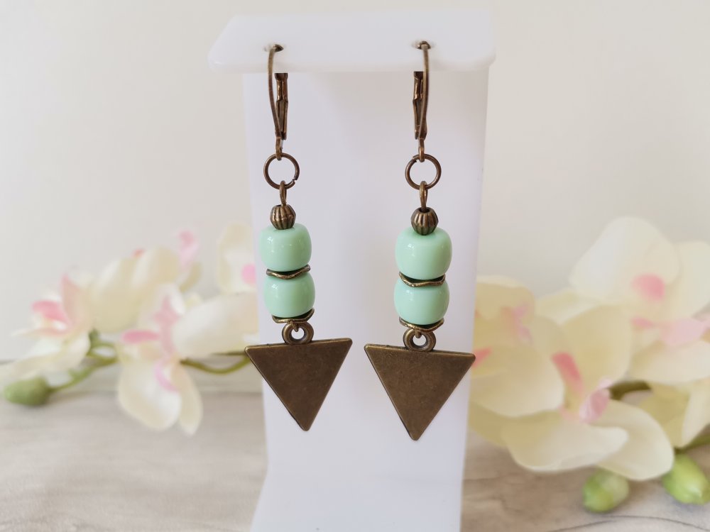 Boucles d'oreilles pendantes avec pendentif triangle en métal, perles en verre colonne et apprêts de couleur bronze