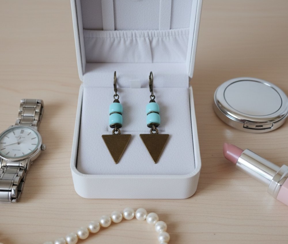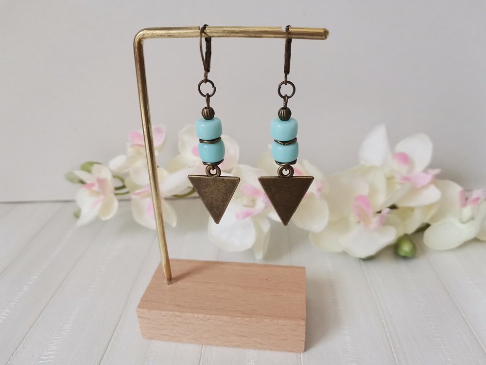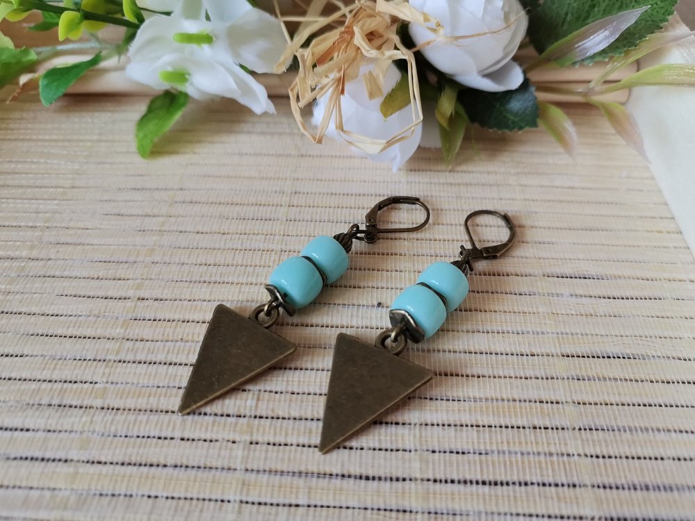 Boucles d'oreilles pendantes avec pendentif triangle en métal, perles en verre colonne et apprêts de couleur bronze