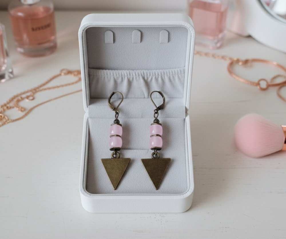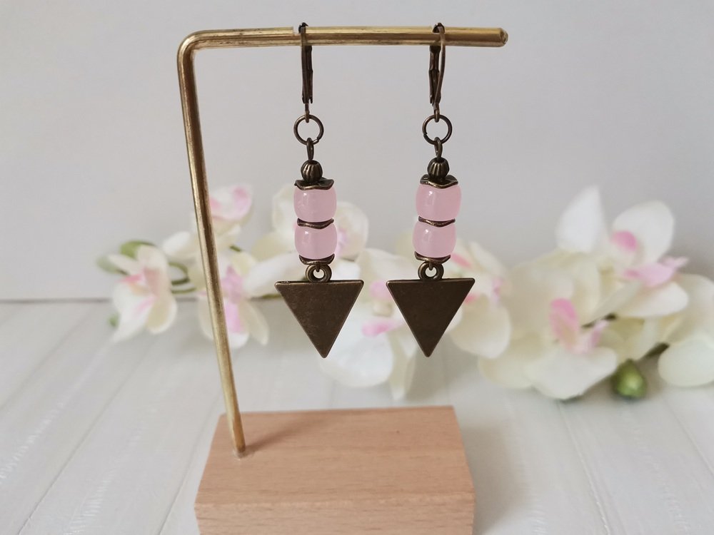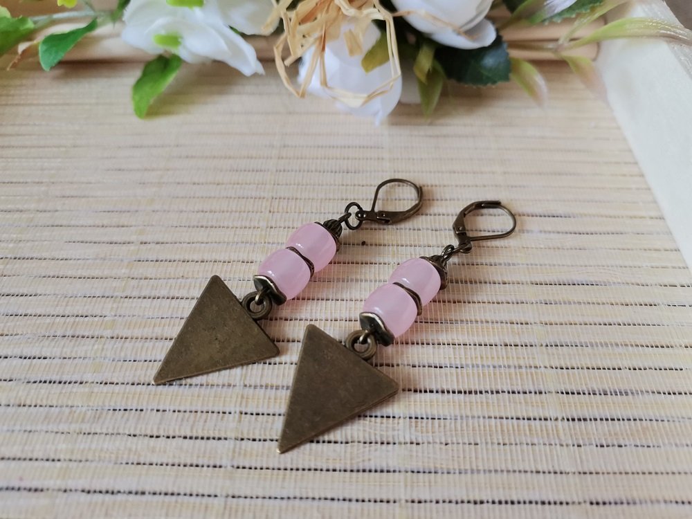 Boucles d'oreilles pendantes avec pendentif triangle en métal, perles en verre colonne et apprêts de couleur bronze