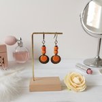 Paire de boucles d'oreilles montées sur dormeuses avec perles en verre colonne de couleur orange et perles métal bronze et pour terminaison un pendentif métal bronze de forme ronde avec sequin émail orange