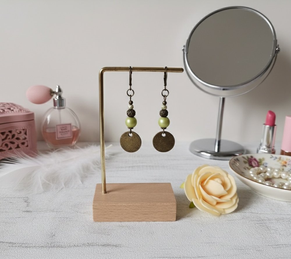 Boucles d'oreilles perles en verre de couleur vert anis et pendentif métal bronze rond