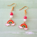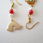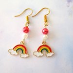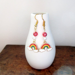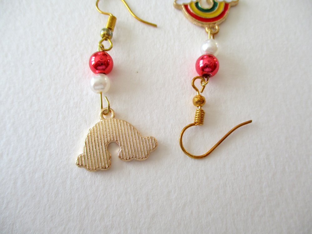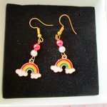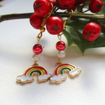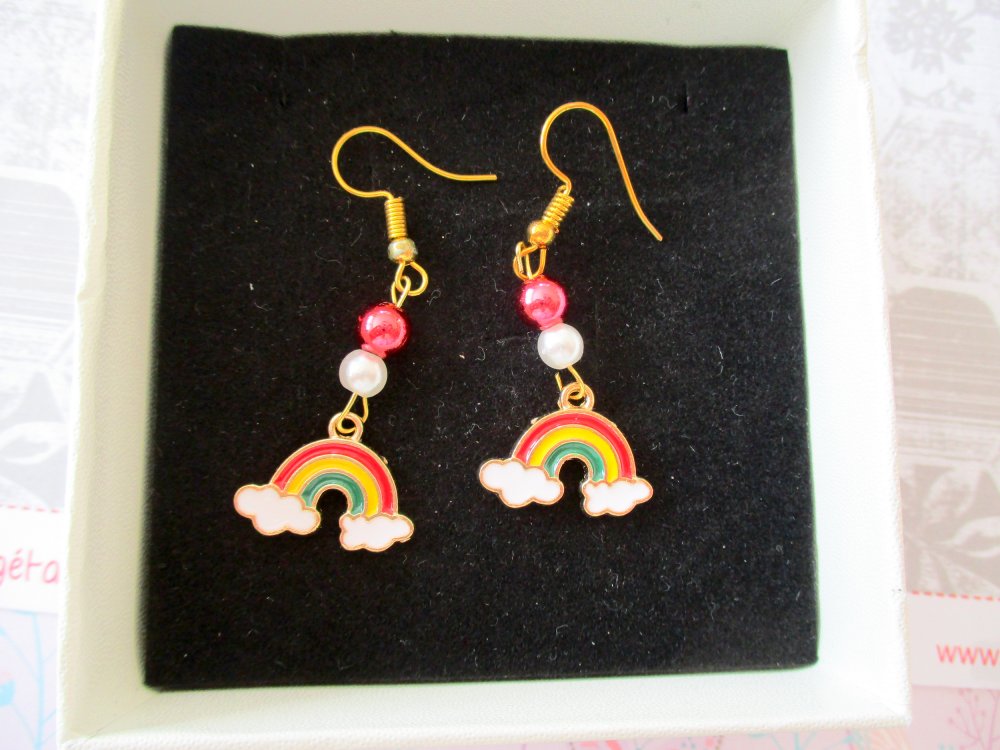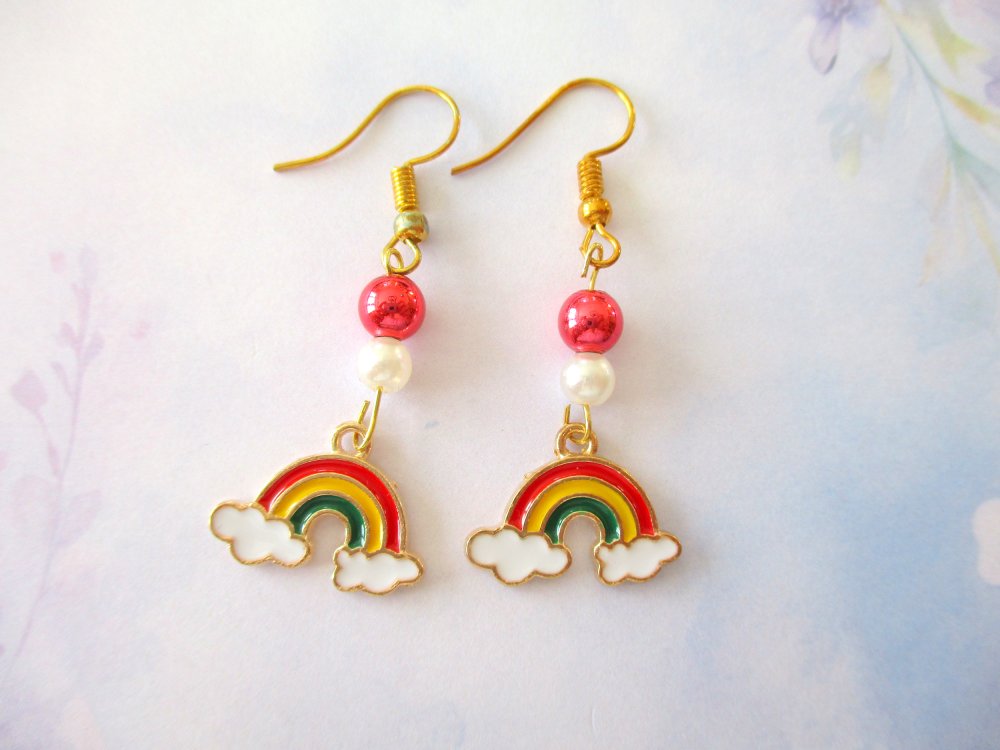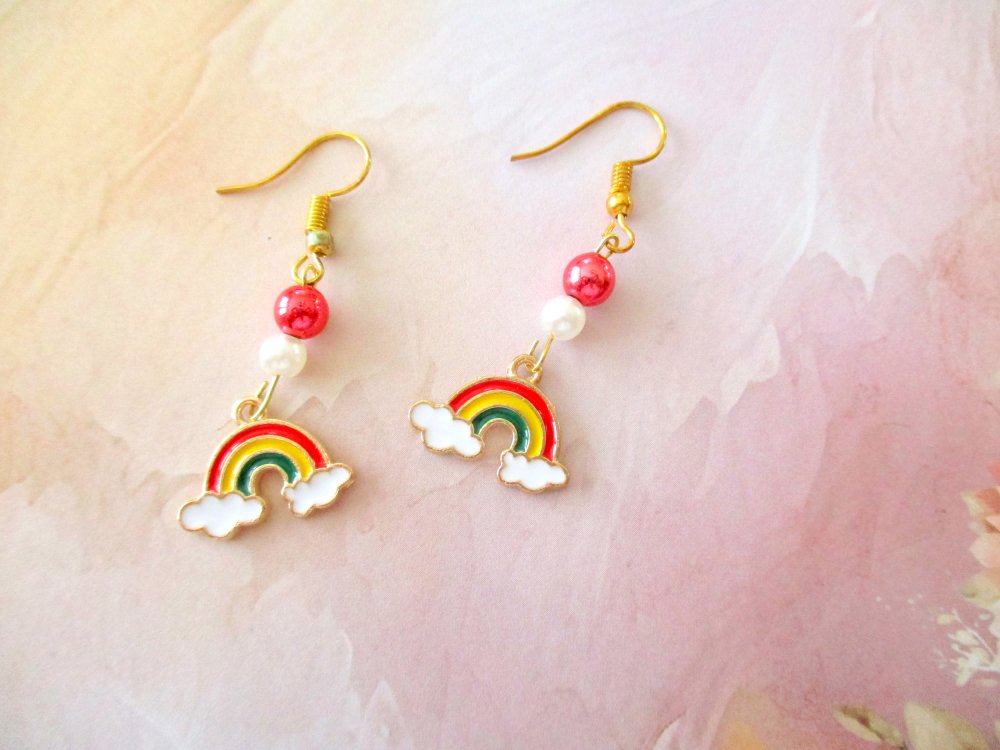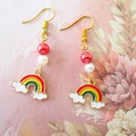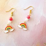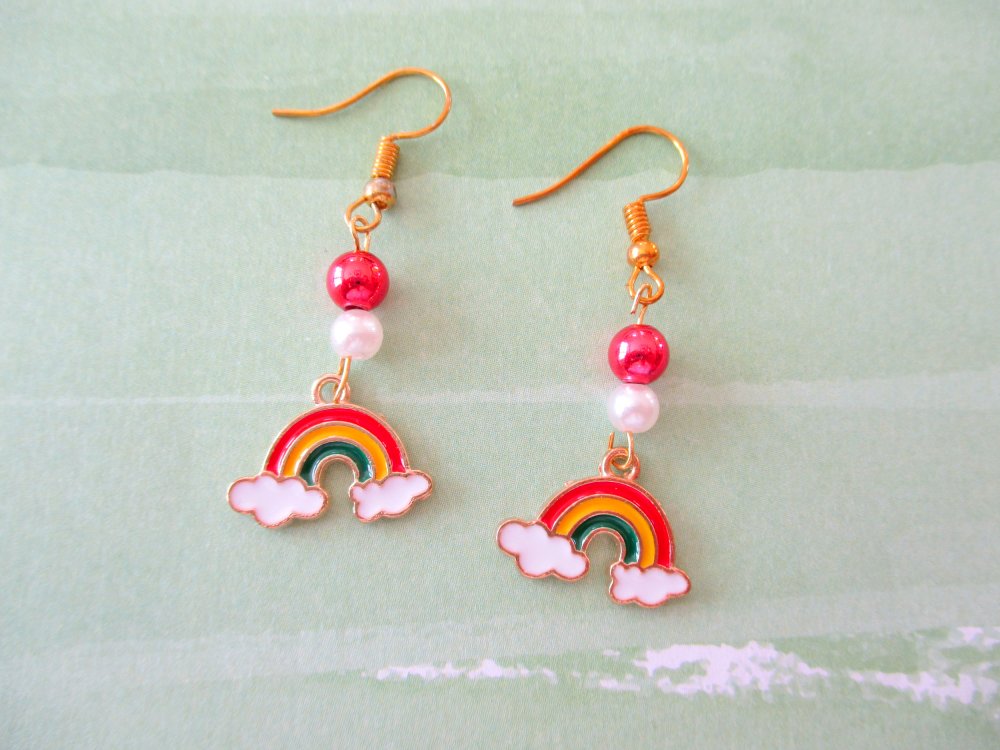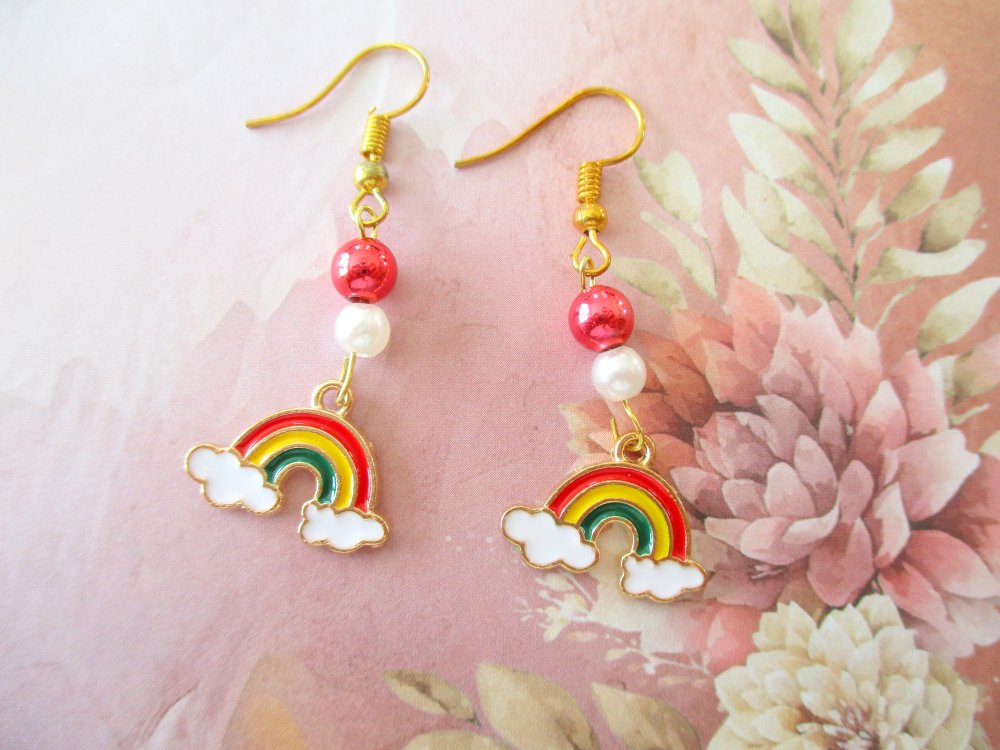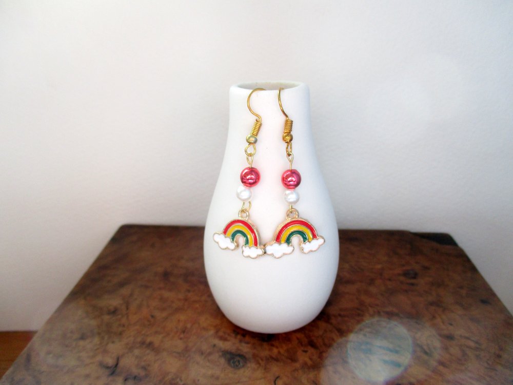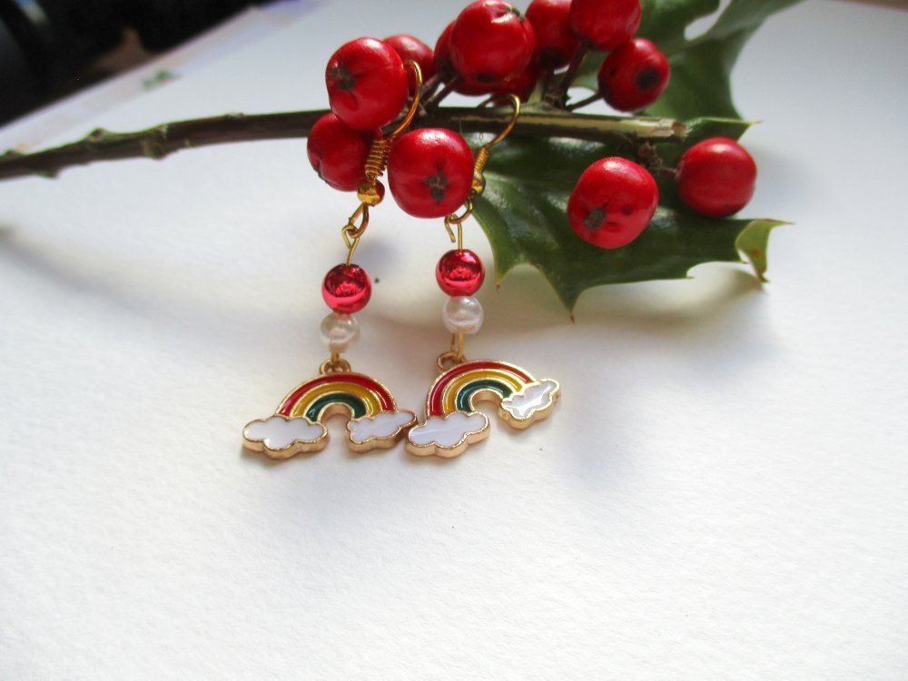 Un petit arc en ciel est suspendu à deux petites perles. Une rouge et une blanche