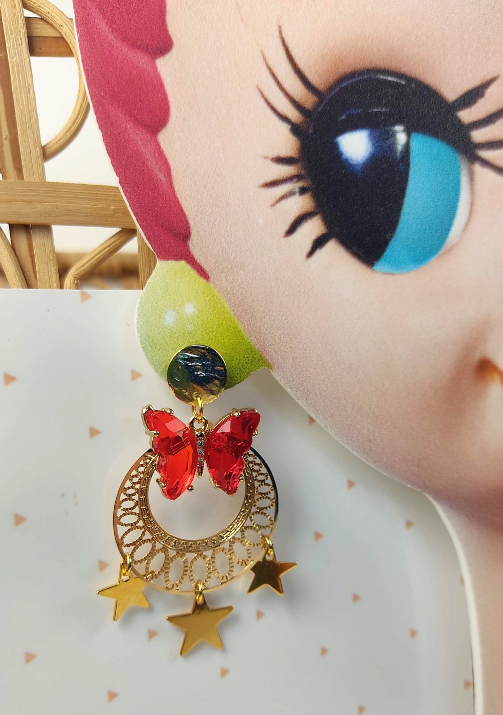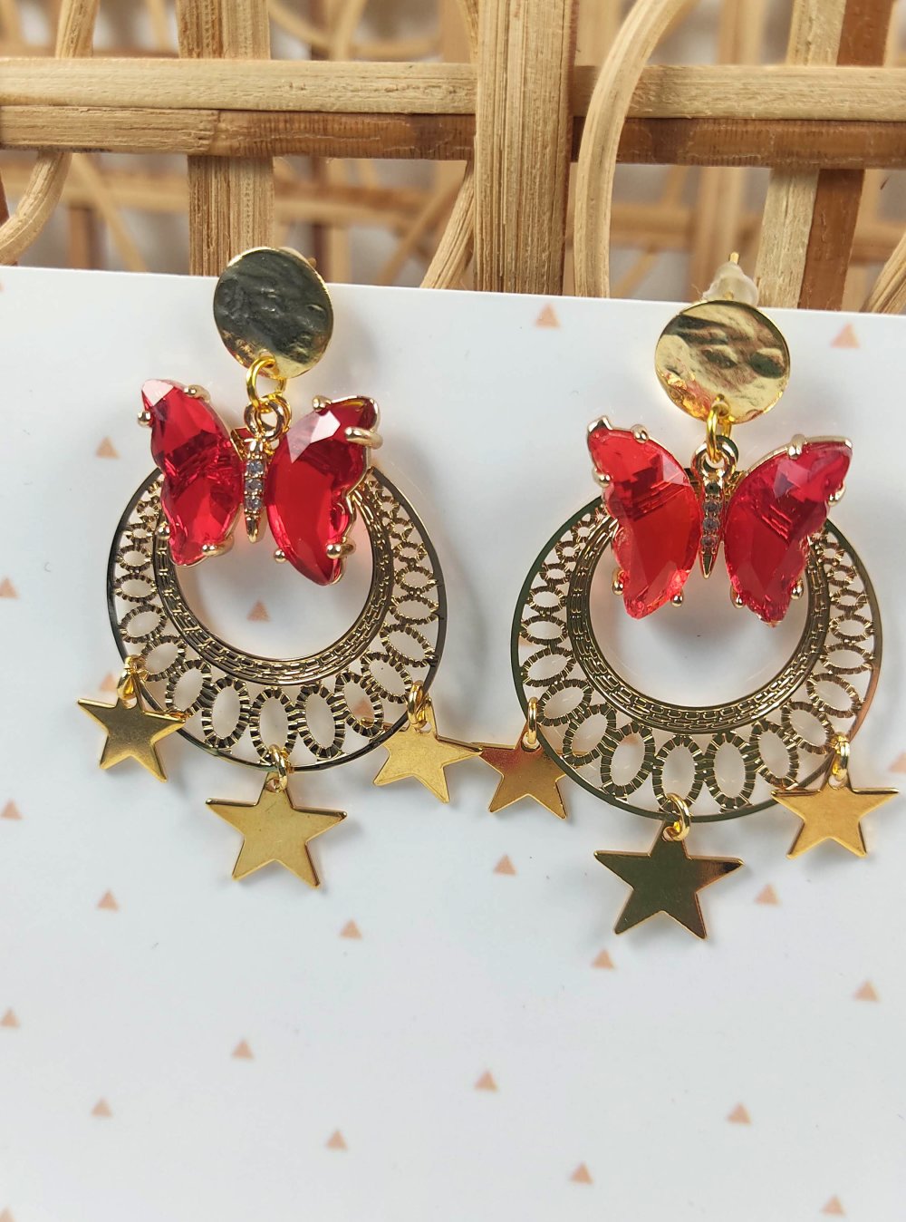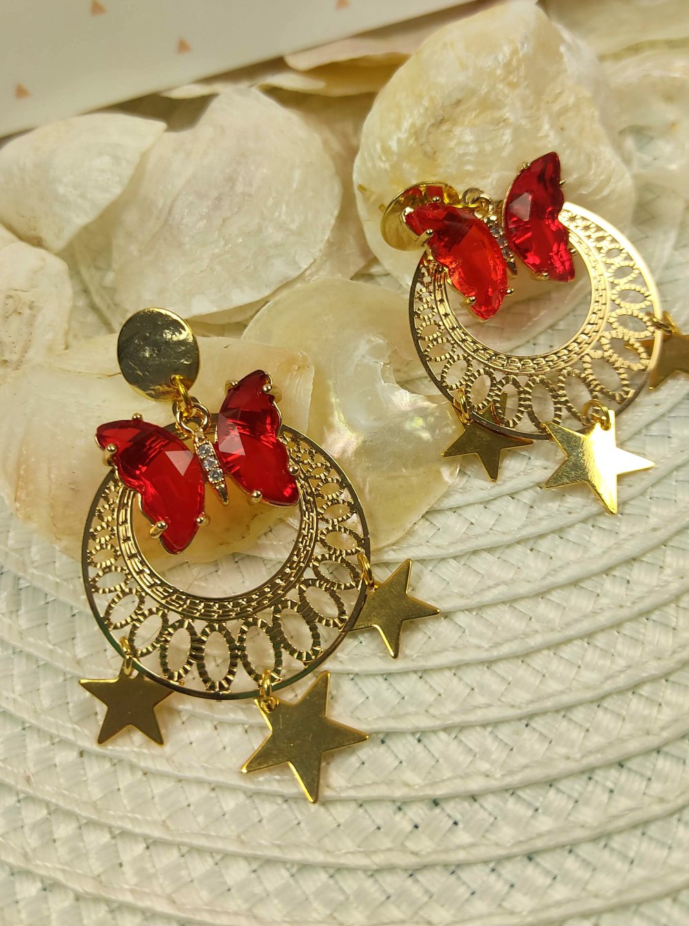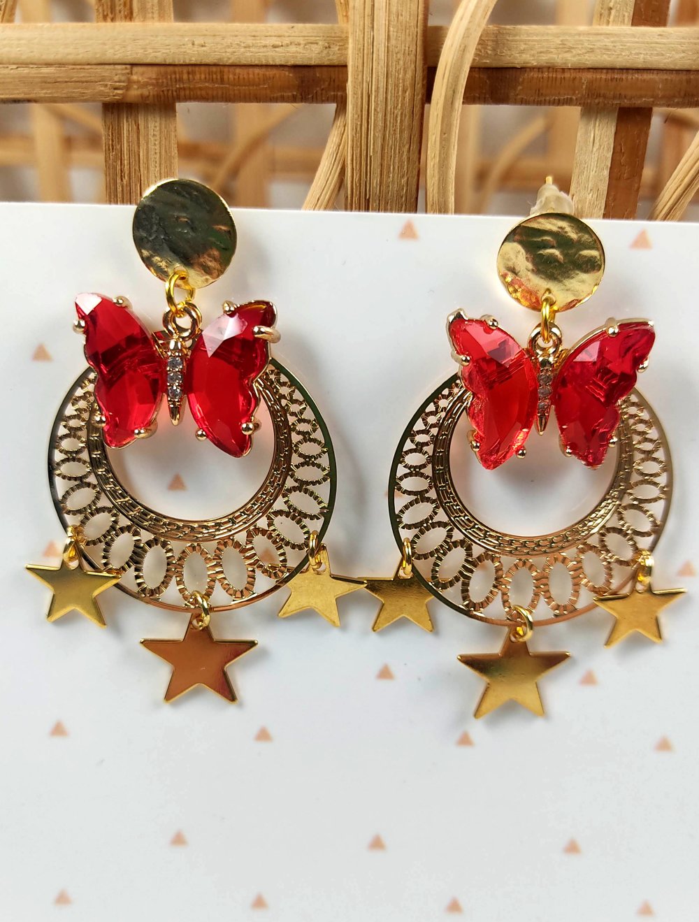 Boucles d'oreilles dorés, étoiles dorés, papillon rouge en verre