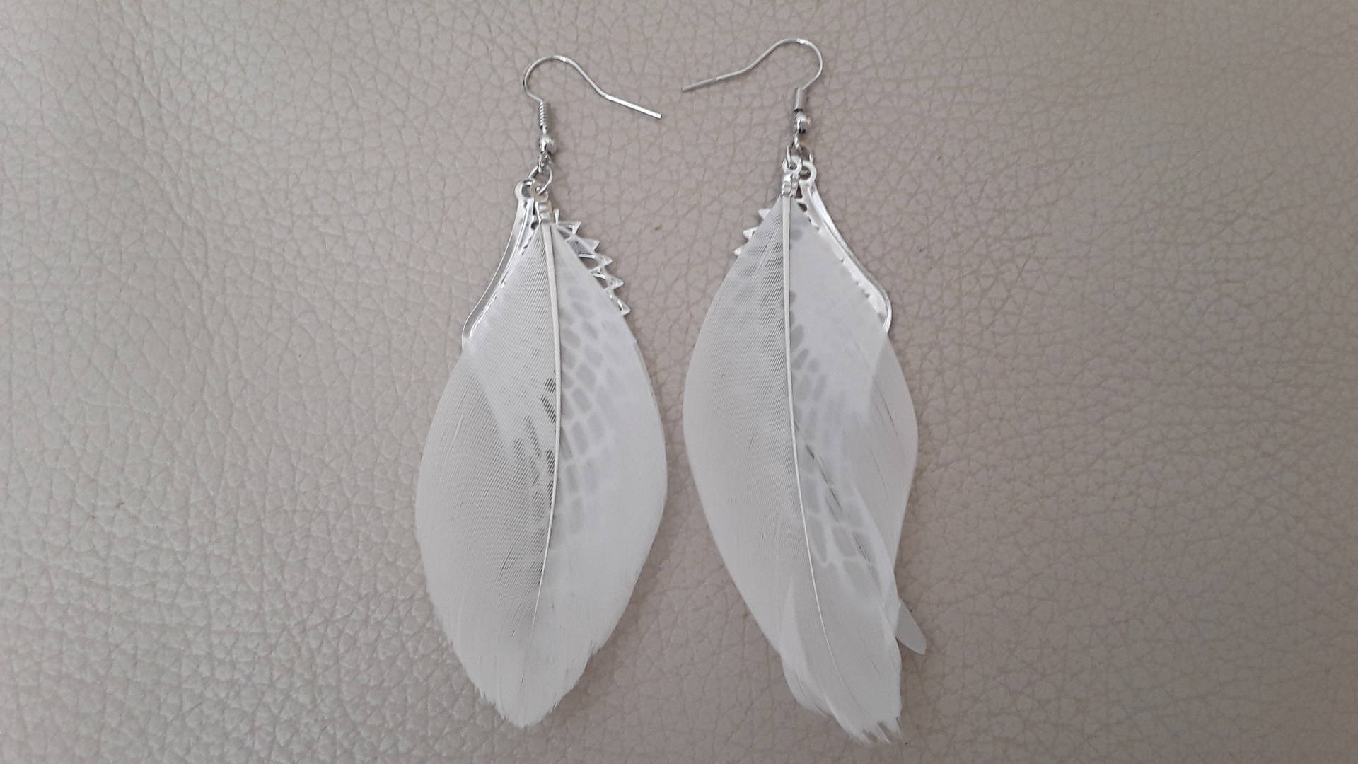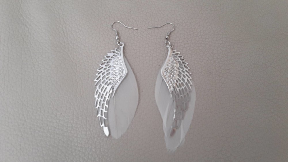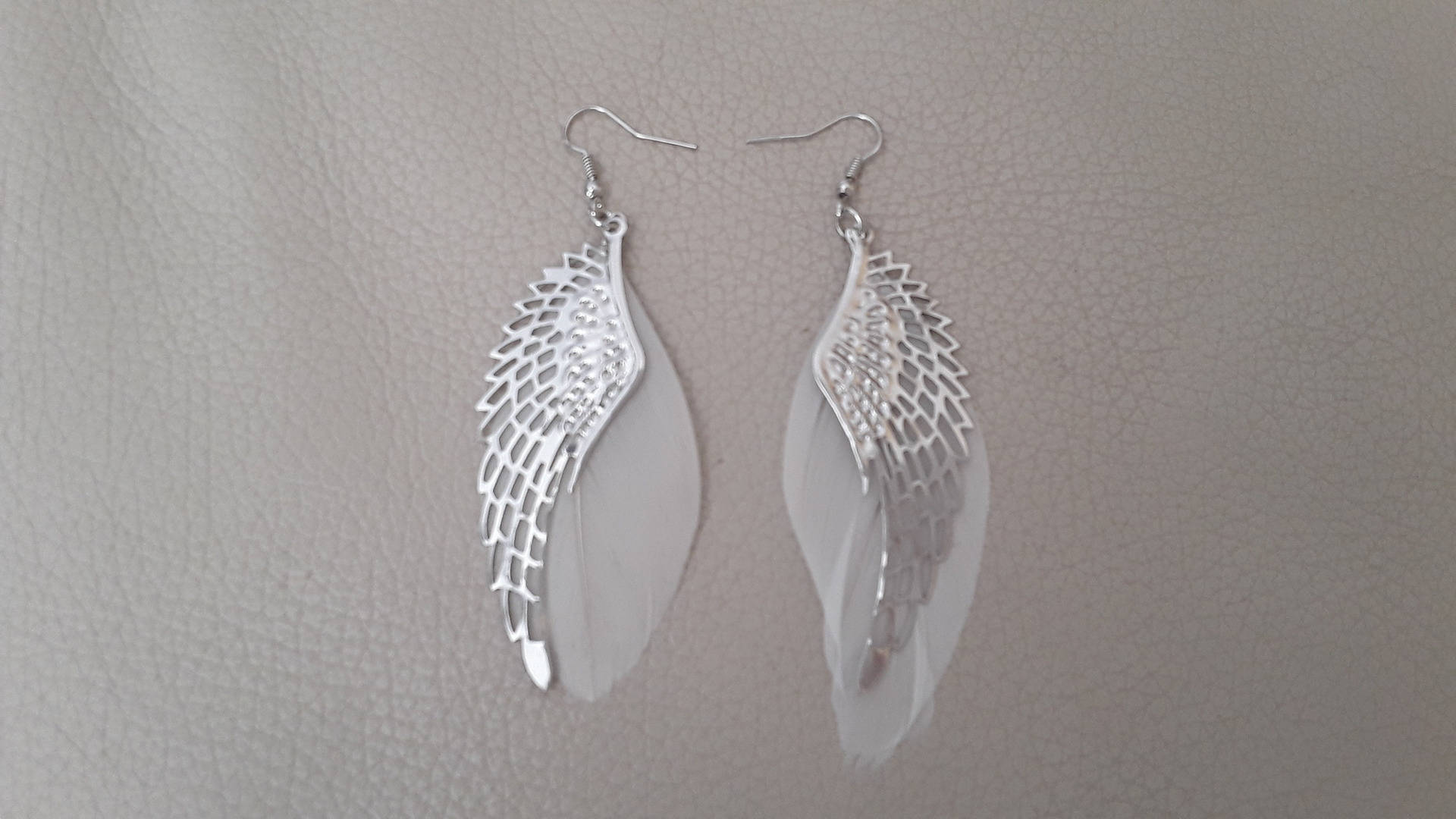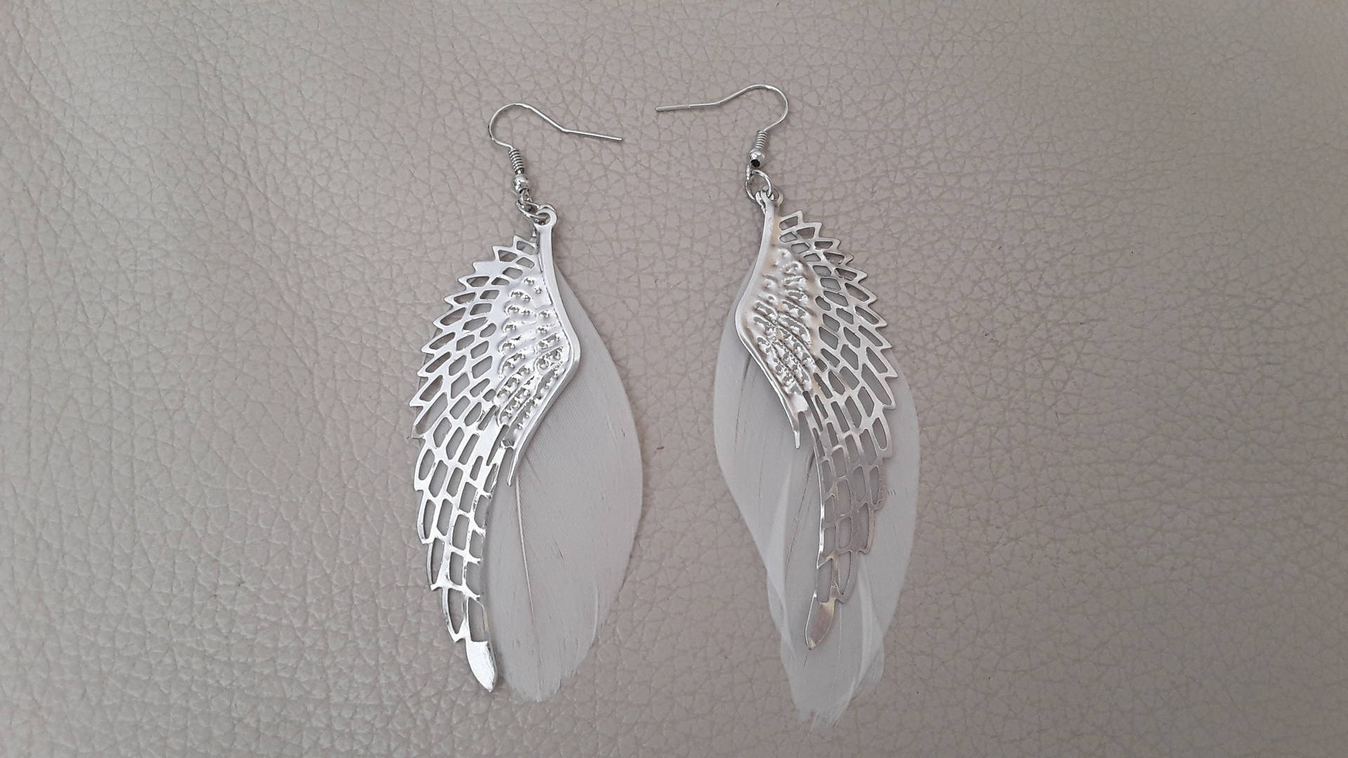 Magnifique paire de boucles d'oreilles plume blanche et aille d ange en métal argenté filigrane