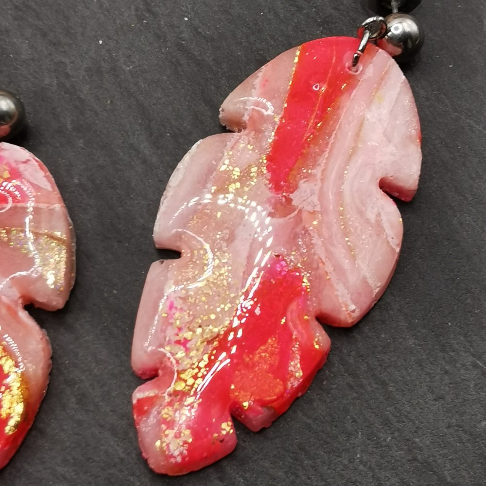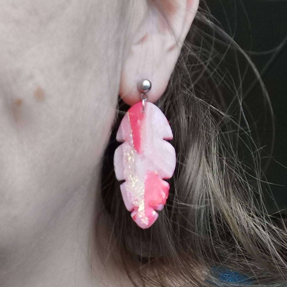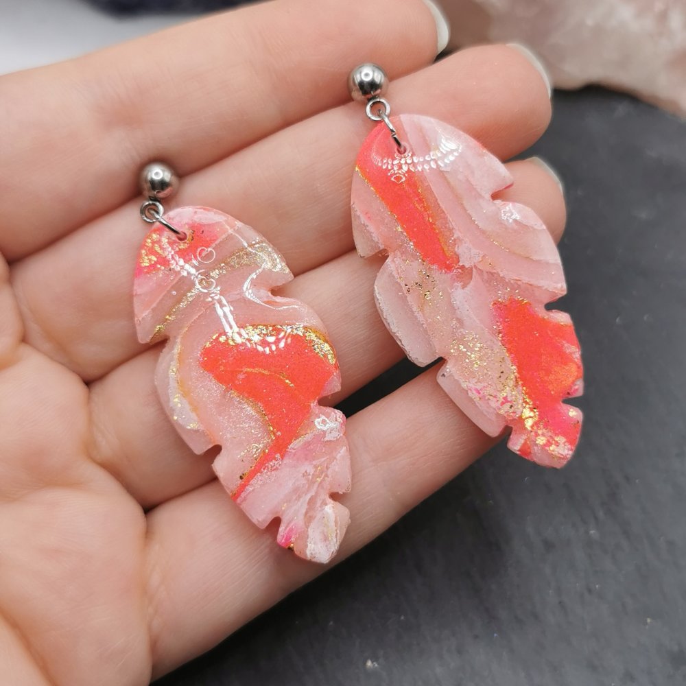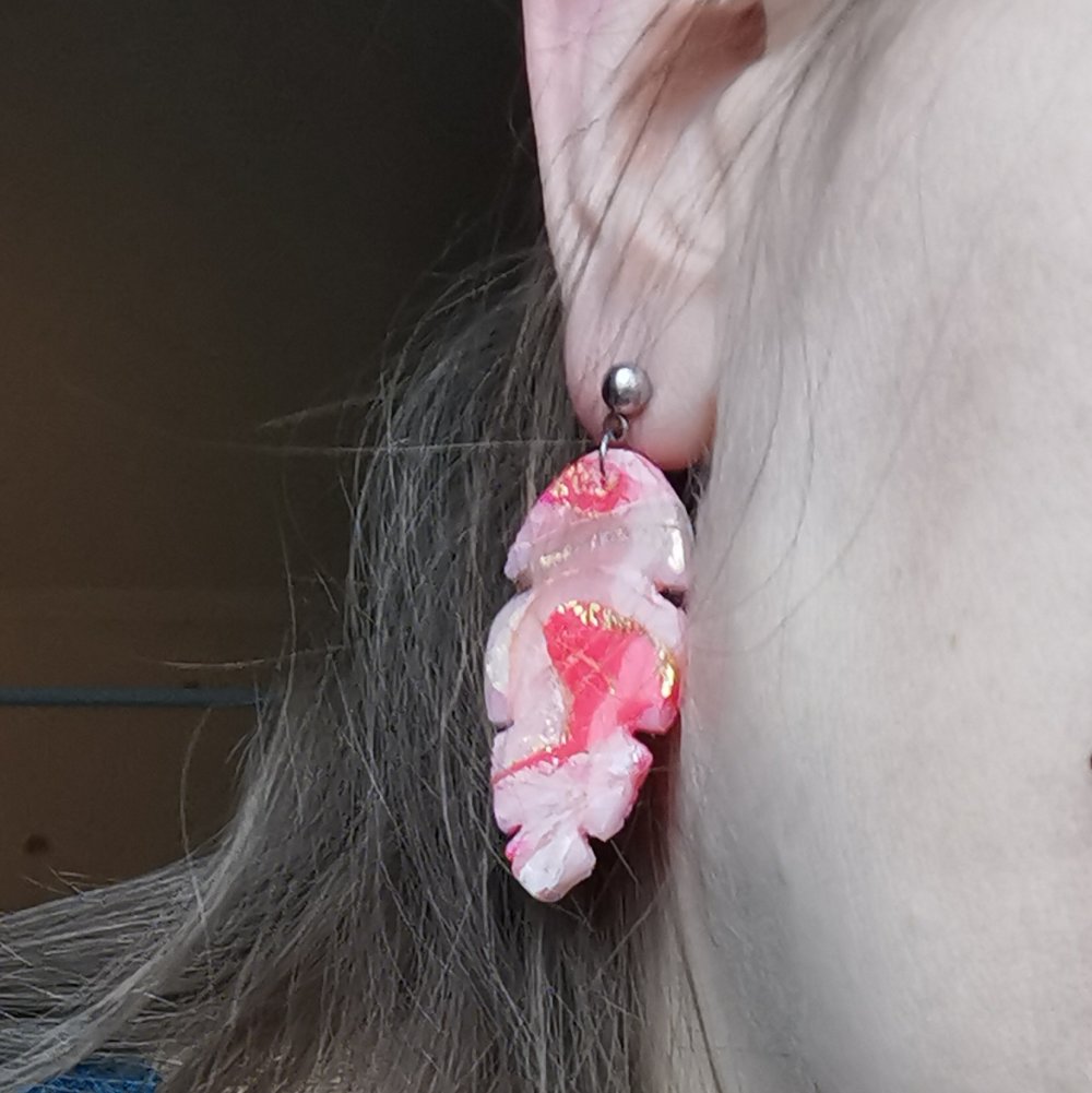 - Boucles d'oreilles en pâte polymère translucide marbré du translucide blanc au rose presque fluo, sublimer par une couche de résine.