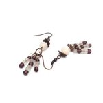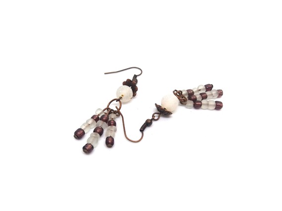 Paire de boucles d'oreille blanche givrée. Les coupelles, les crochets et les anneaux sont en métal couleur cuivre. Les grosses perles sont verre poli blanche craquelé, les grosses perles de rocaille sont en verre coloris blanc poli et coloris prune.
