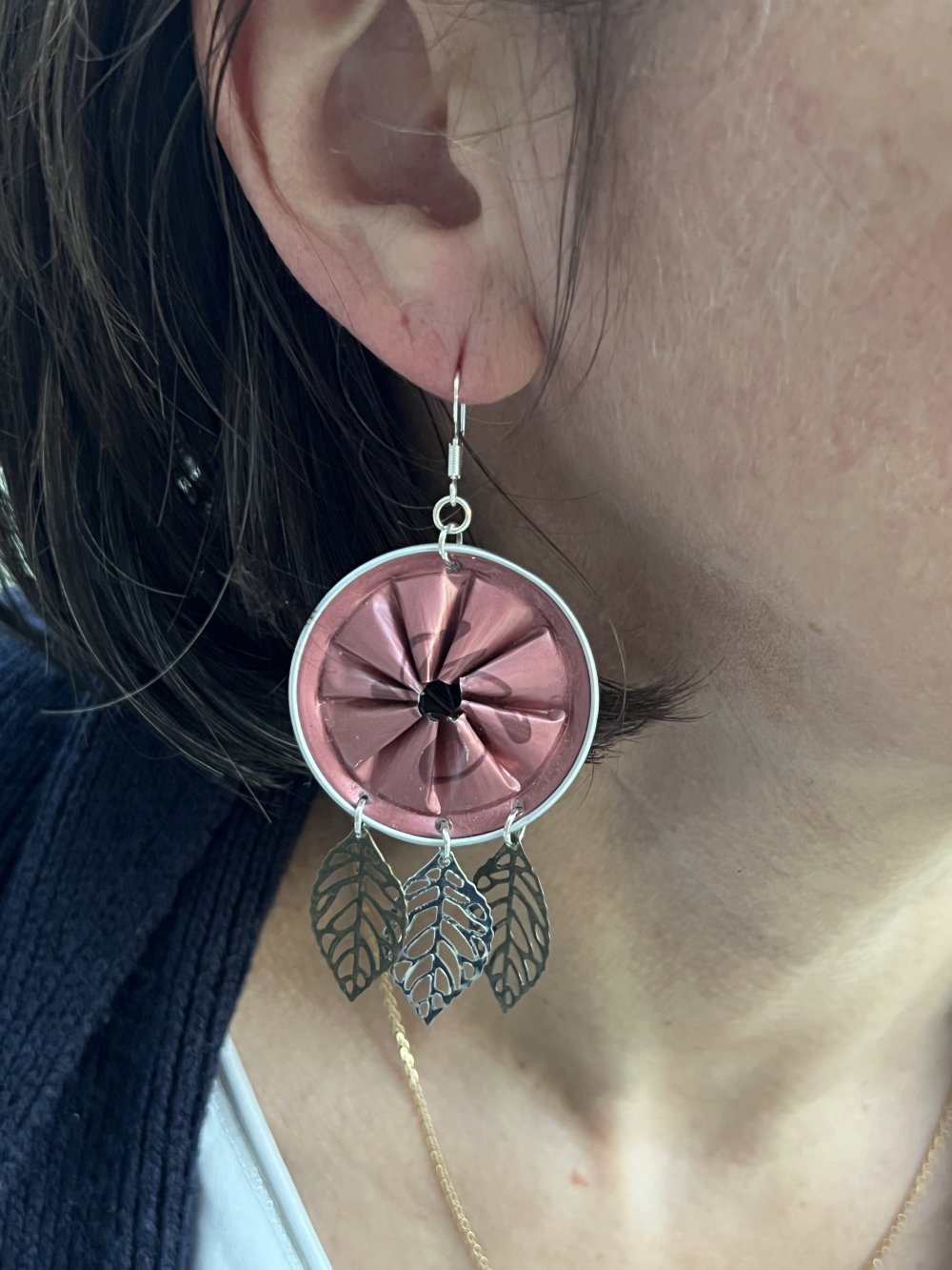 Ces boucles d'oreilles sont réalisées avec des capsules de café en aluminium surcyclées.