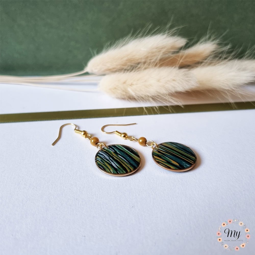 Boucles d'oreilles rondes en argile polymère et résine, les éléments sont en acier inoxydable doré, agrémenté d'une perle assortie.