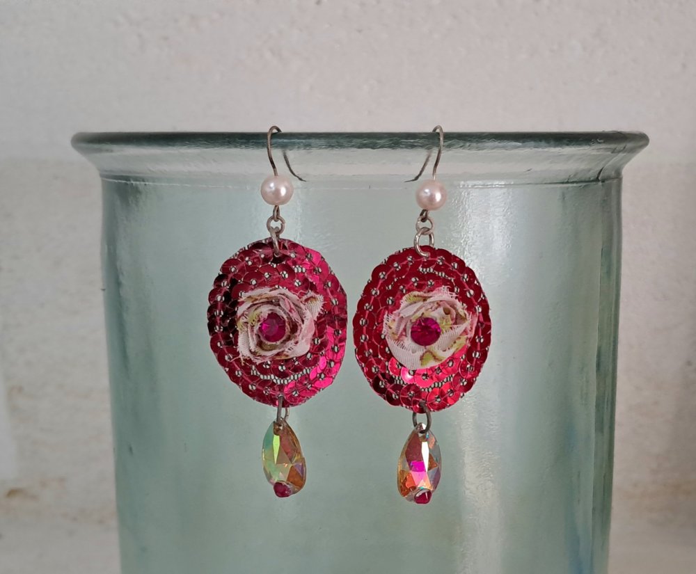Boucles d'oreilles pendantes rose vif , fushia, sequins , perle ,strass , tissu