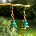 Boucles d'oreilles hyper légères, idéales pour fêter Noël, composées d'une breloque émaillée en forme de sapin de Noël vert avec petite étoile rouge au sommet.