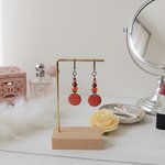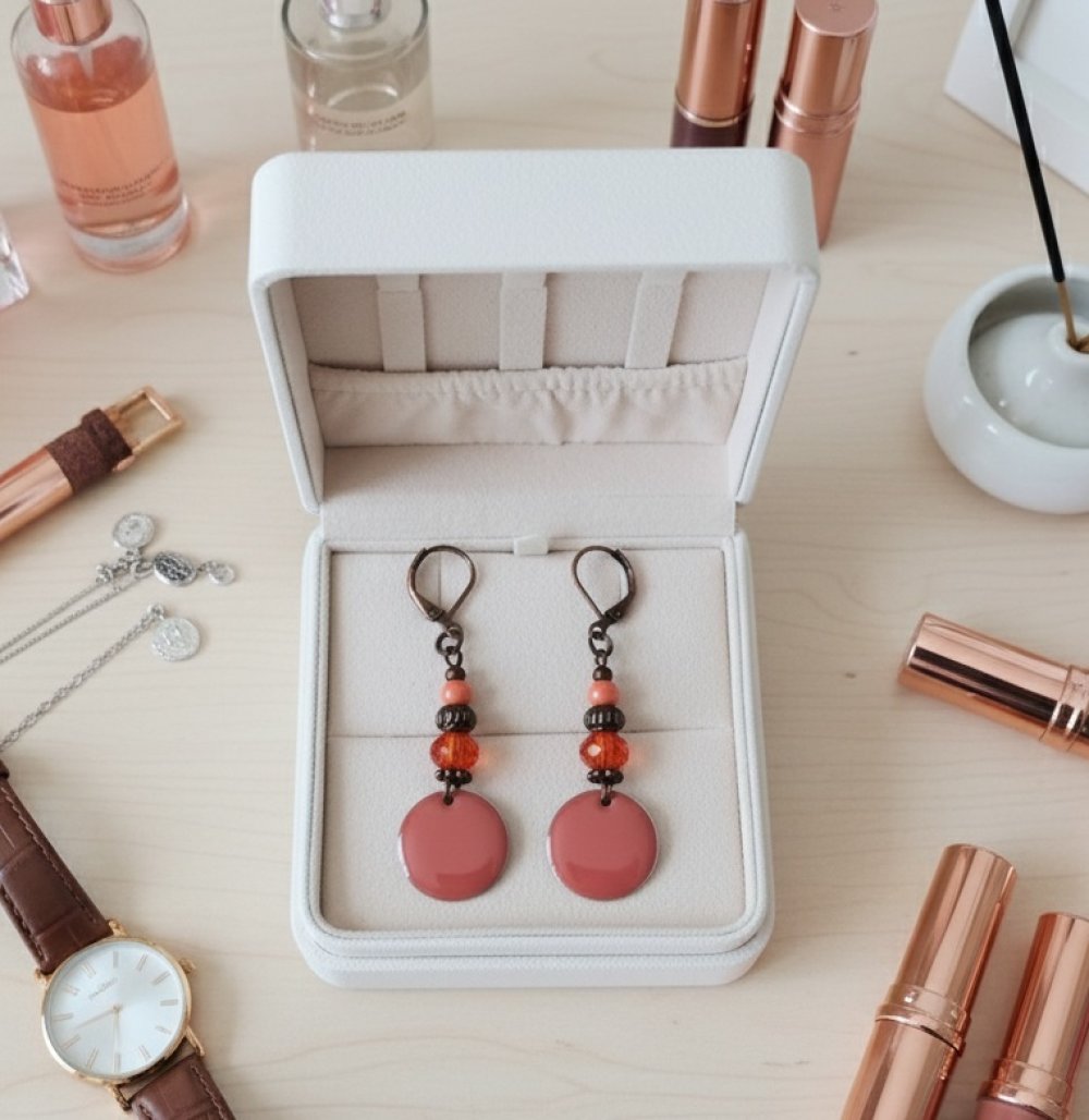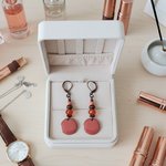 Paire de boucles perles en verre et sequin émail couleur corail avec apprêts de couleur cuivre rouge