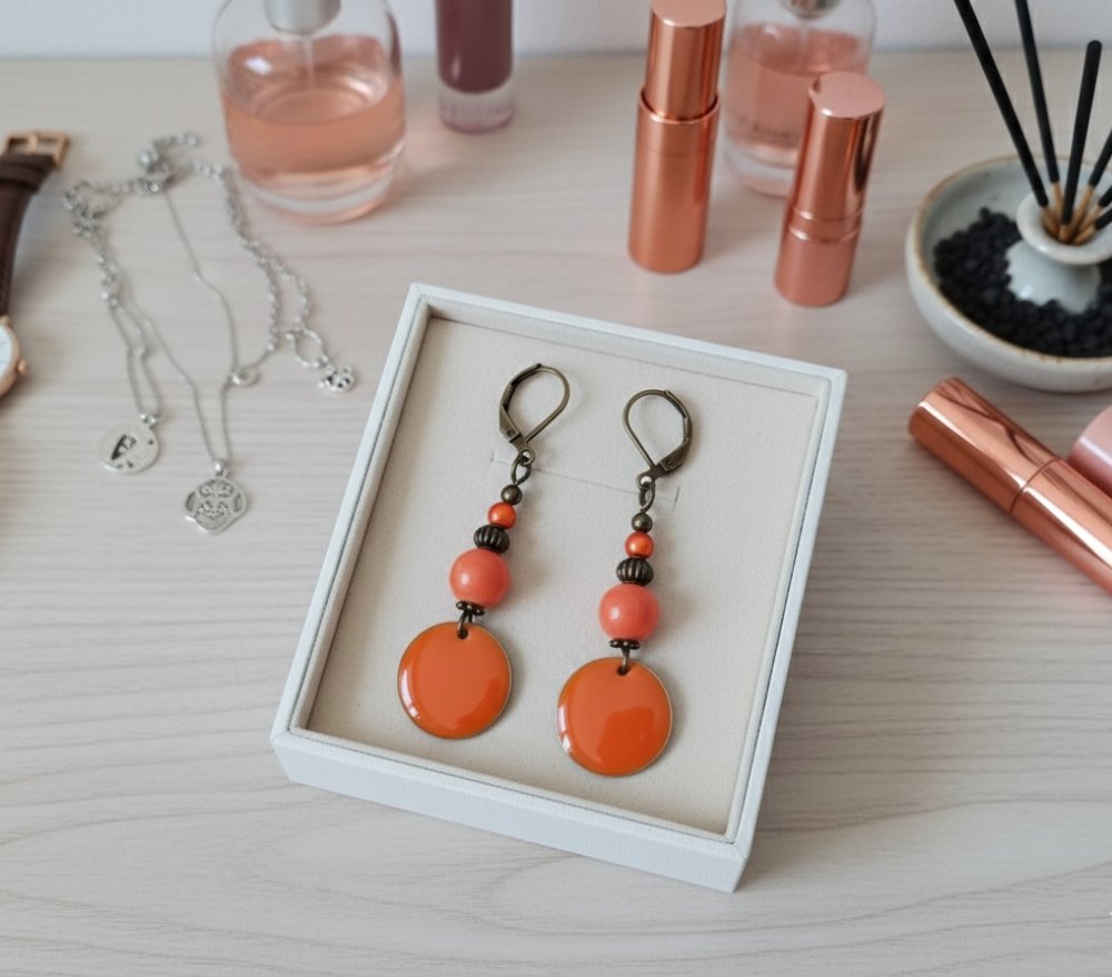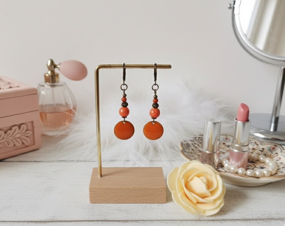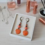 Paire de boucles d'oreille sequin émail rond de couleur orange et perles en verre orange