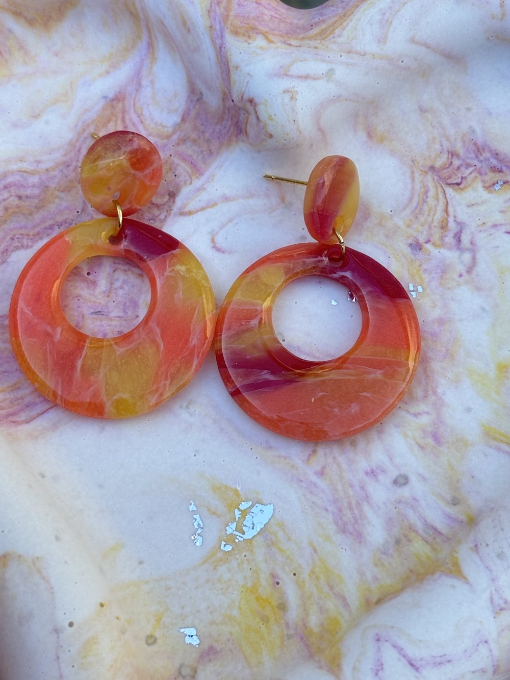 Leur design circulaire apporte modernité et légèreté, tandis que les effets marbrés rendent chaque pièce unique. Fait en pâte polymère et acier inoxydable avec finition résine UV.