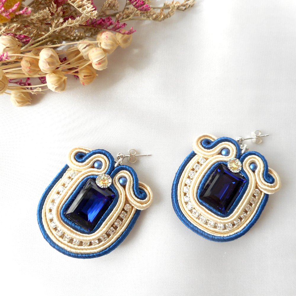Éblouissez avec ces boucles d'oreilles cousues main en soutache bleu marine et crème, ornées de strass scintillants. Le magnifique cristal bleu saphire rectangulaire en fait une pièce maîtresse de votre collection.