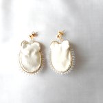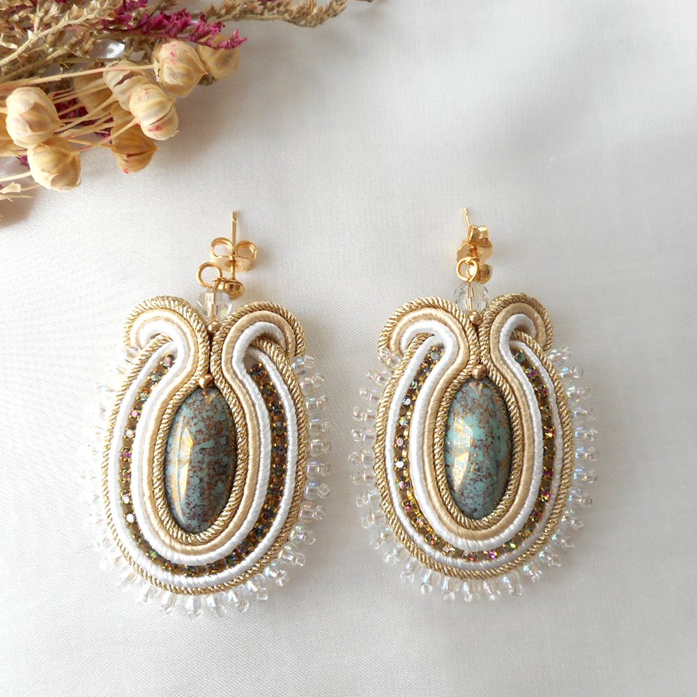 Ajoutez une touche d'élégance à votre look avec ces boucles d'oreilles en soutaches or et crème. Ornées de cabochons et de perles en verre tchèque, ces pièces uniques scintillent grâce à leur strass délicat.