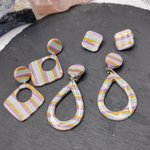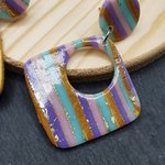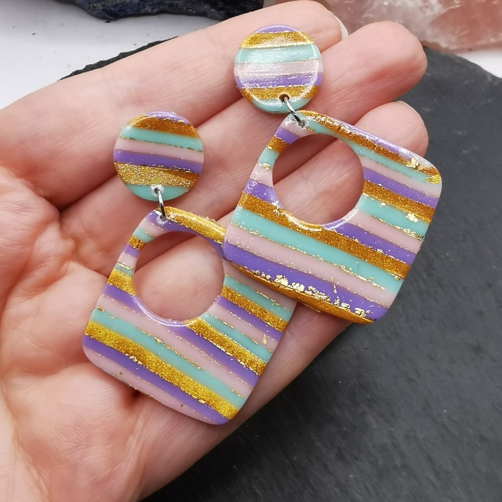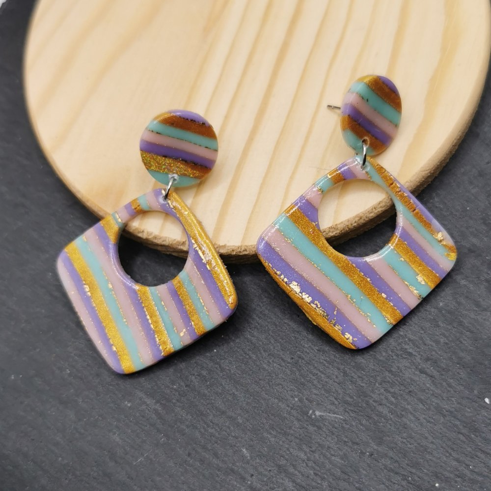 - Boucles d'oreilles en pâte polymère rayée violet, rose, vert menthe et or