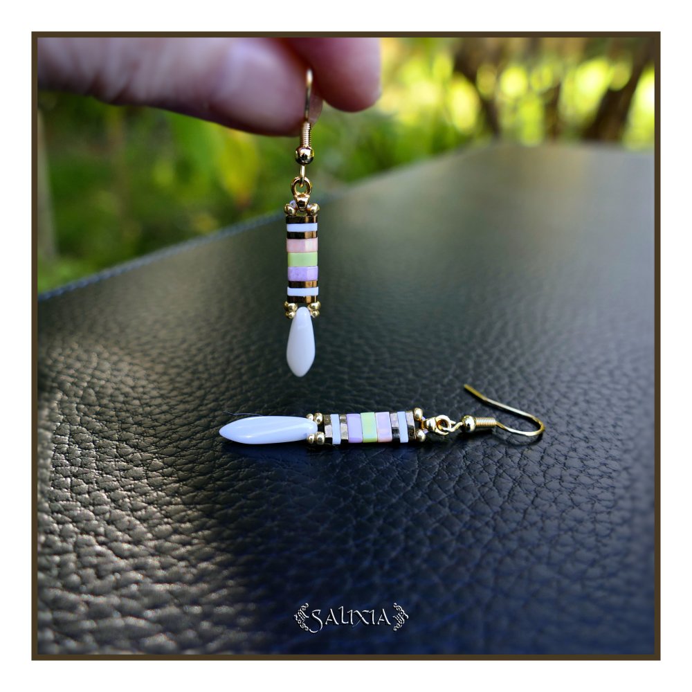 Boucles d'oreilles tissées perles japonaises tila gouttes de Bohème blanches crochets acier inoxydable doré.