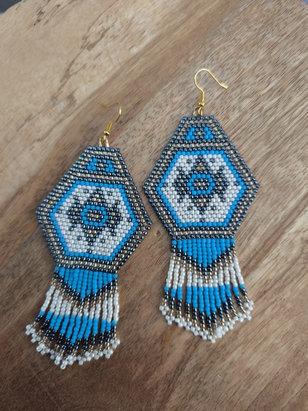 Ces boucles d’oreilles au design géométrique hexagonal sont entièrement tissées à la main avec des perles Miyuki de grande qualité. Les nuances de bleu, blanc et doré s’associent harmonieusement pour créer un bijou à la fois moderne et inspiré de l’artisanat traditionnel.