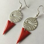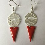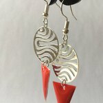 Boucles d'oreilles, très légères, composées d'une estampe ovale de 2 cm en métal argenté, motif ondulations, et d'un beau sequin émaillé forme triangle de couleur rouge vif.