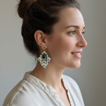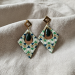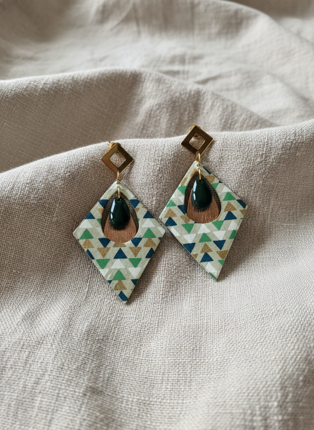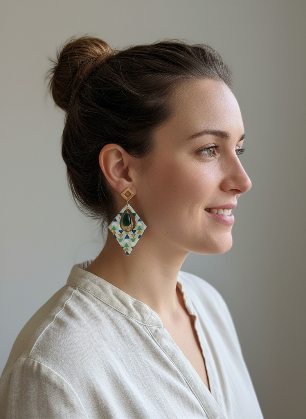Ces boucles d’oreilles uniques ont été réalisées à la main à partir d’un papier indien beige sélectionné avec soin, décoré de motifs triangulaires vert, bleu et doré.