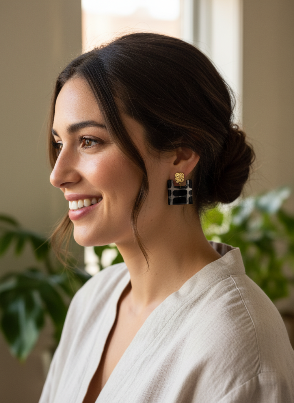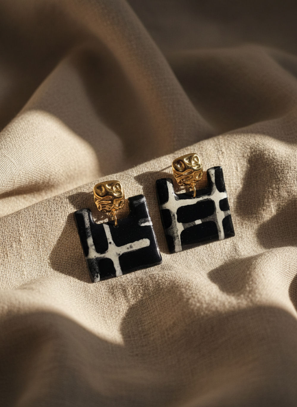 Ces boucles d’oreilles originales sont réalisées à la main à partir de papier népalais bleu et blanc, au motif graphique unique. Chaque paire est sublimée par un clou d’oreille martelé en acier inoxydable doré, pour une touche élégante et contemporaine.