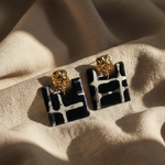 Boucles d’oreilles carrées en papier népalais bleu et blanc – motif graphique et clous dorés martelés en acier inoxydable