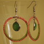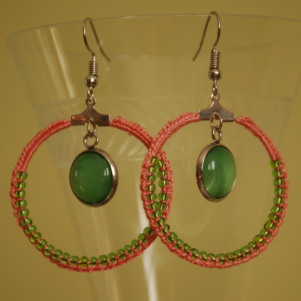 Originale, toute en rondeur, cette paire de boucles d'oreilles est unique. La boucle se compose d'un cabochon central (en résine verte) monté sur un anneau créole, dans lequel sont insérées des perles de rocaille vertes, et recouvert d'un fil de coton rose (au crochet). Le crochet américain est en alliage sans nickel de couleur argent et muni d'un frein.