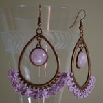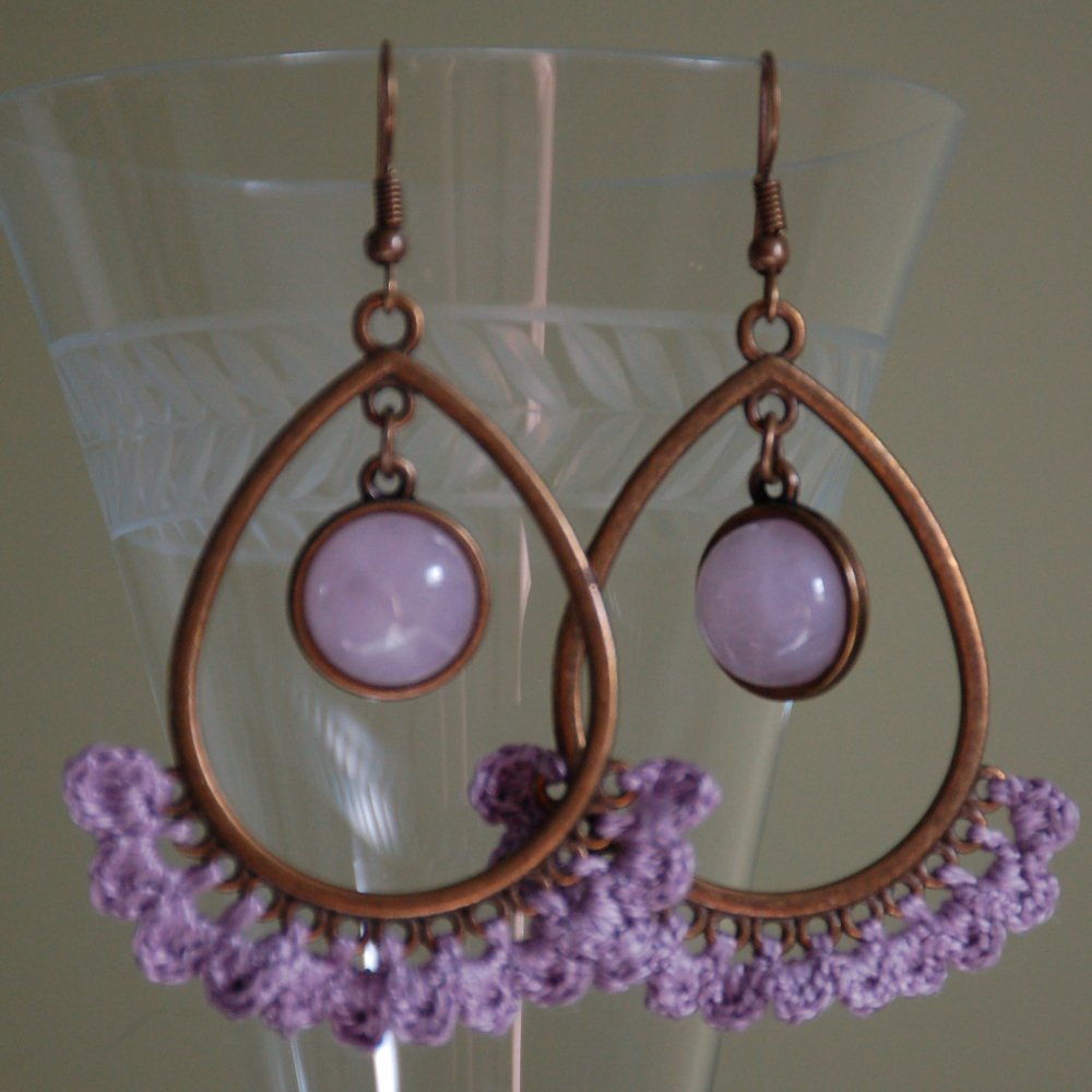 Création originale, cette paire de boucles d'oreilles est une pièce unique. La boucle se compose d'un cabochon central en gemme Quartz rose. Il est monté sur un support oval (forme goutte) sur lesquel j'ai crocheté une petite dentelle en fil de coton. Le crochet américain est en alliage sans nickel de couleur bronze et muni d'un frein.