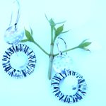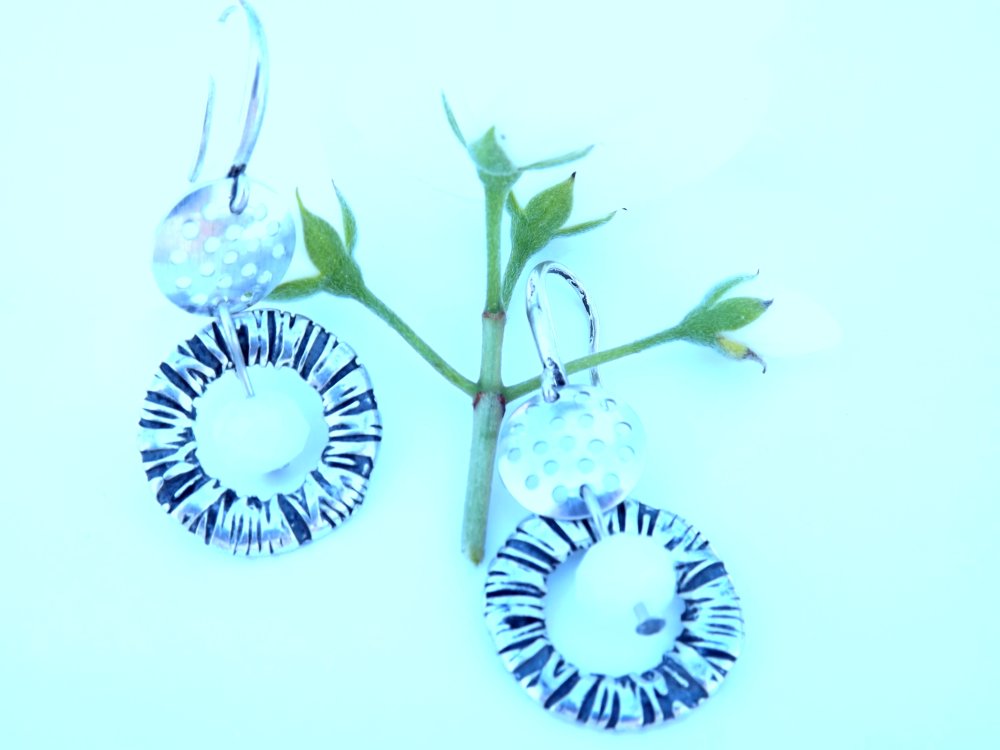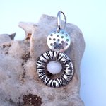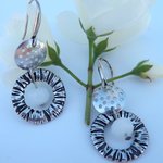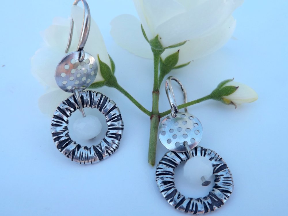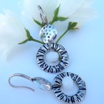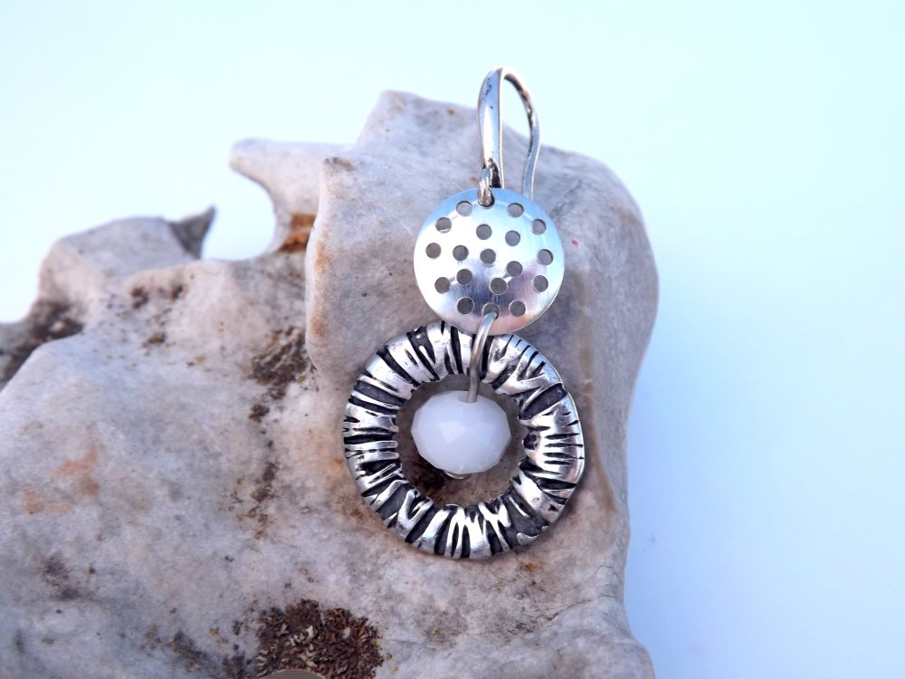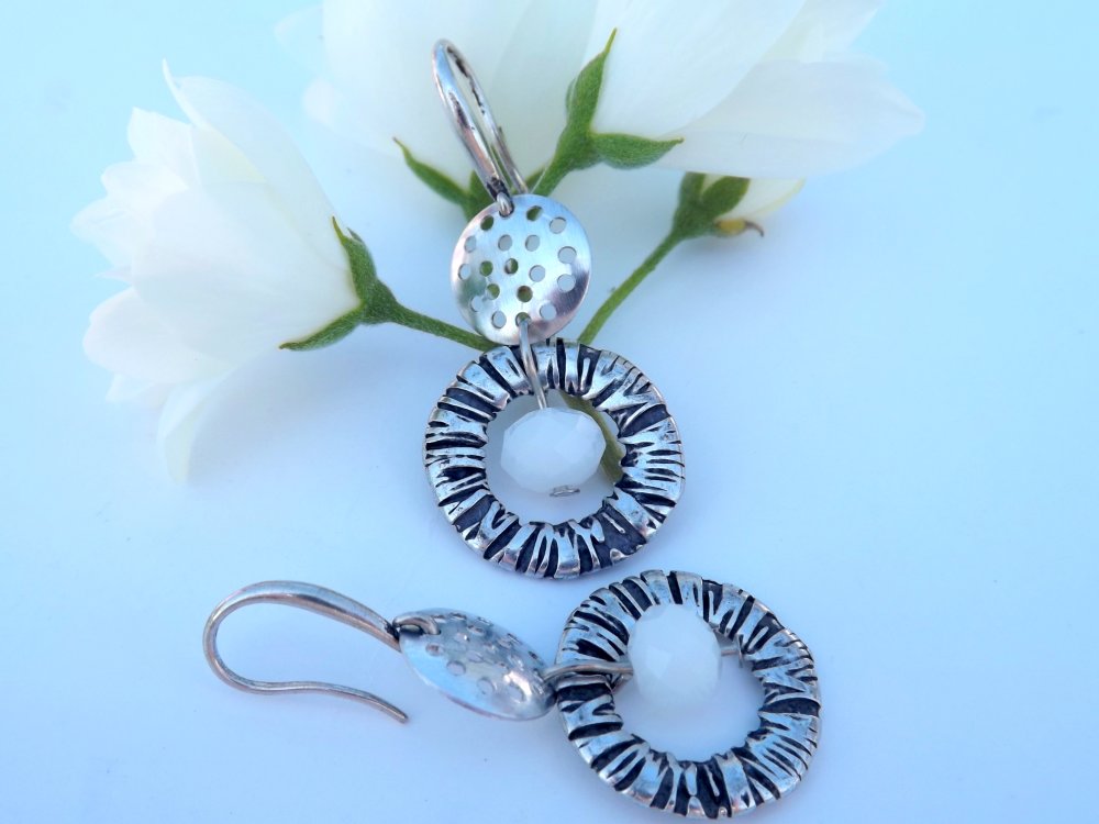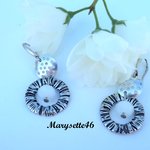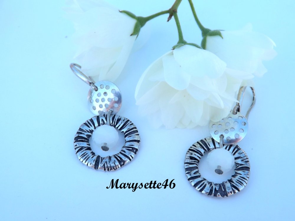Boucles d'oreilles en métal argenté au connecteur tamis de 12 mm, soutenu par un anneau strié de 20 mm d'où est lovée une perle facettée blanche de 6 x 18 mm.