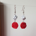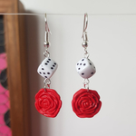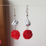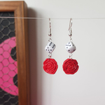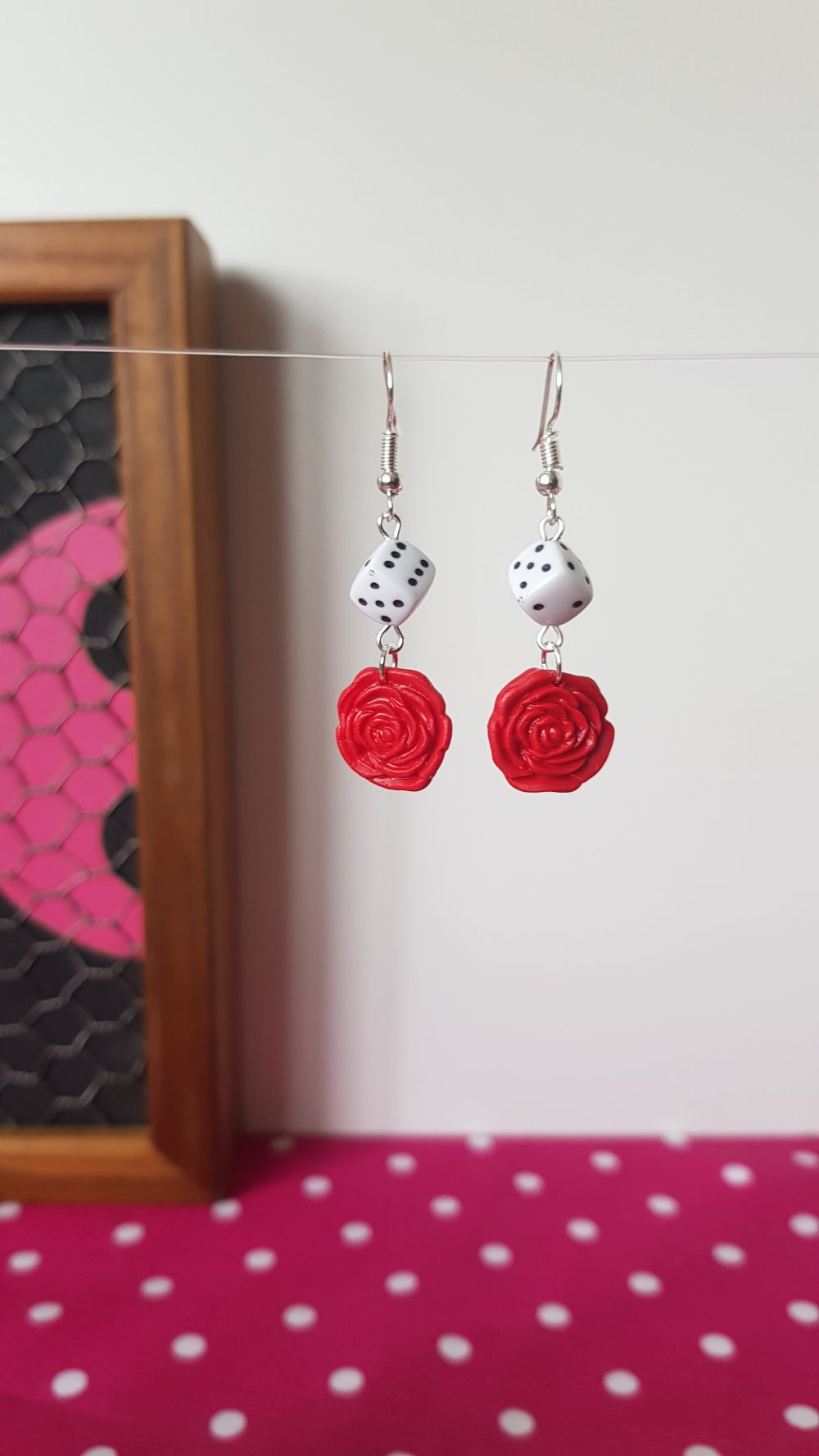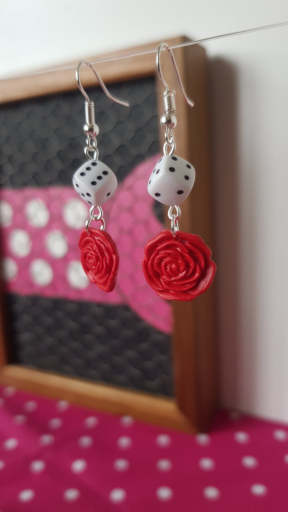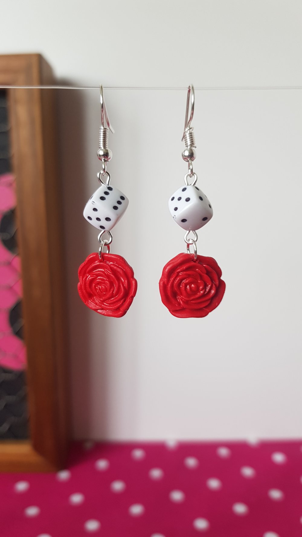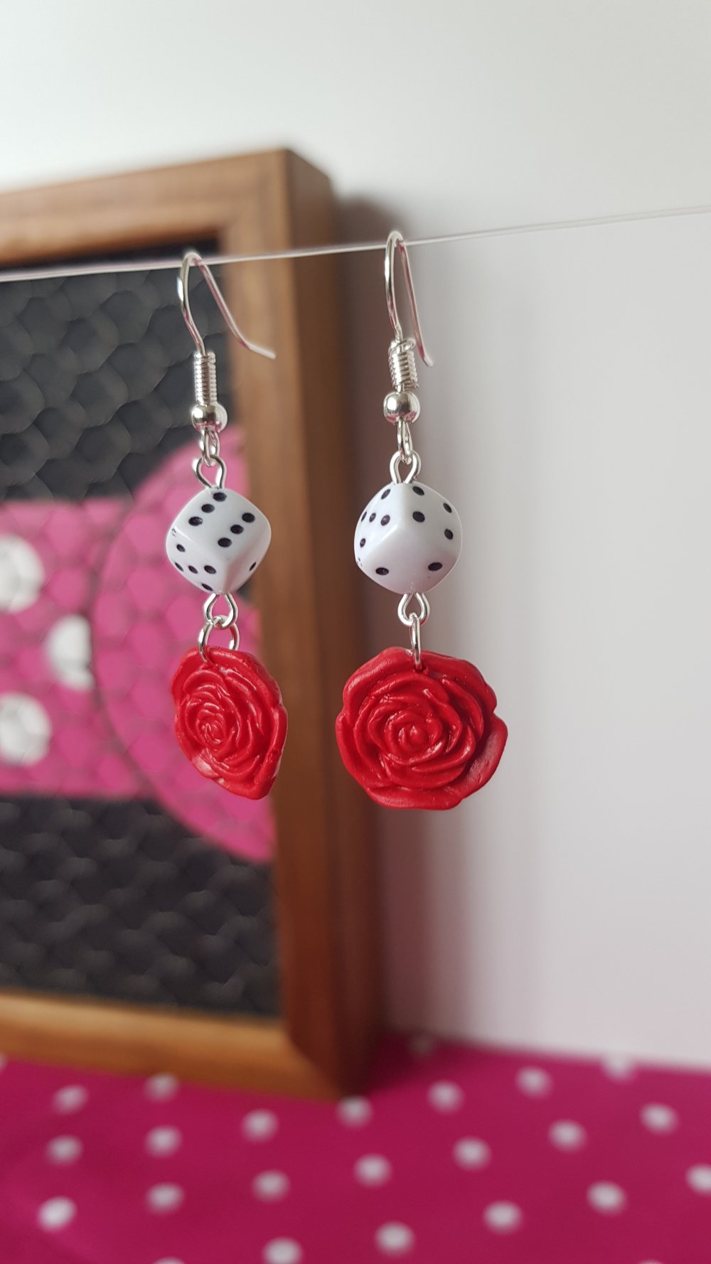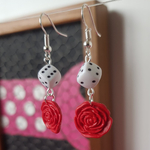 Féminine et rock'n roll ! Boucles d'oreilles pendantes avec perle en forme de dé blanc à pois noirs et rose suspendue, emblématiques et affirmées !