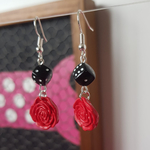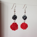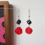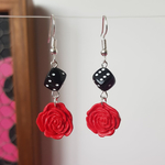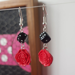 Emblématique et originalité pour ces boucles d'oreilles pendantes , perle en forme de dé noir à pois blanc et rose rouge suspendue, le tout pour un rendu rock et féminin !