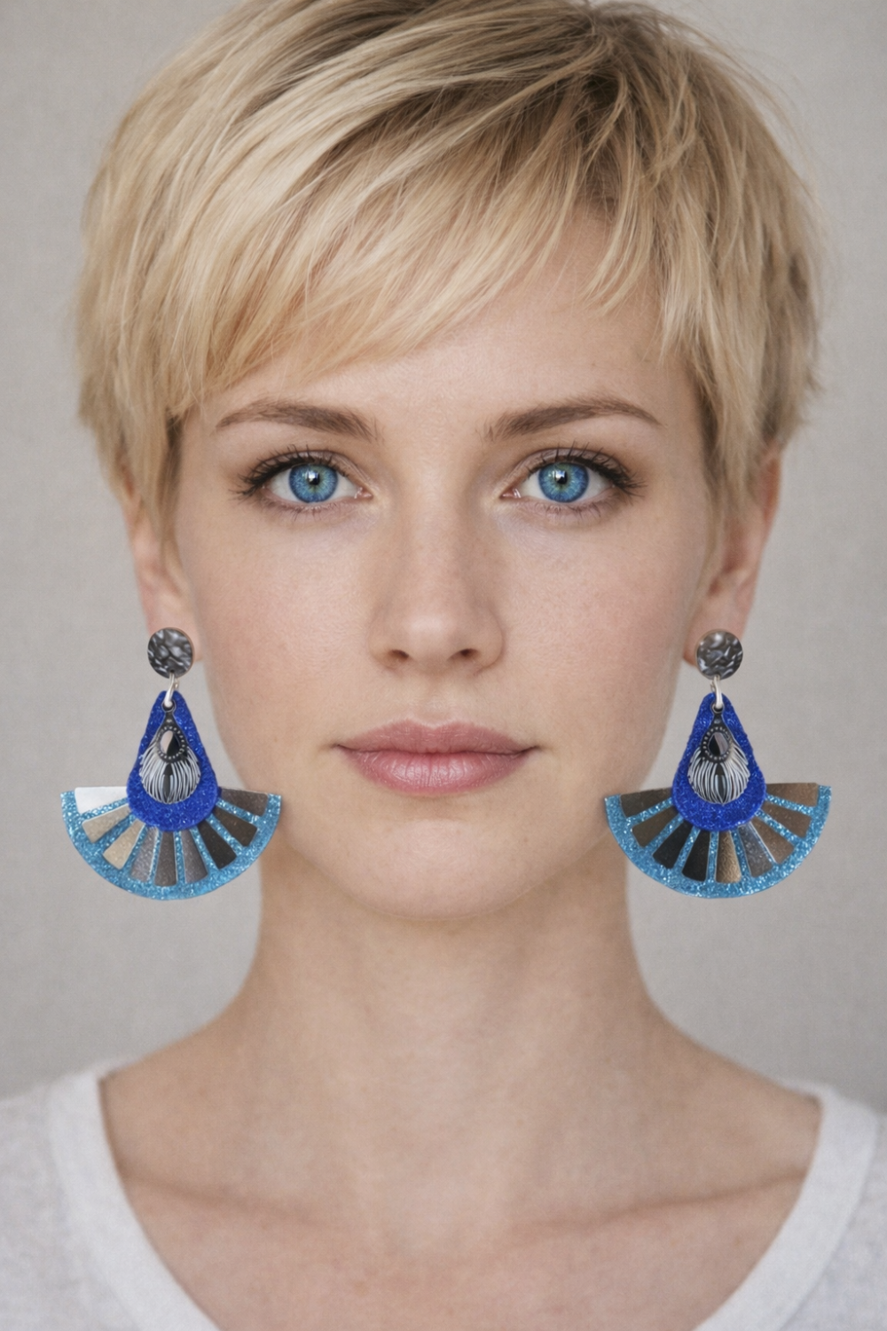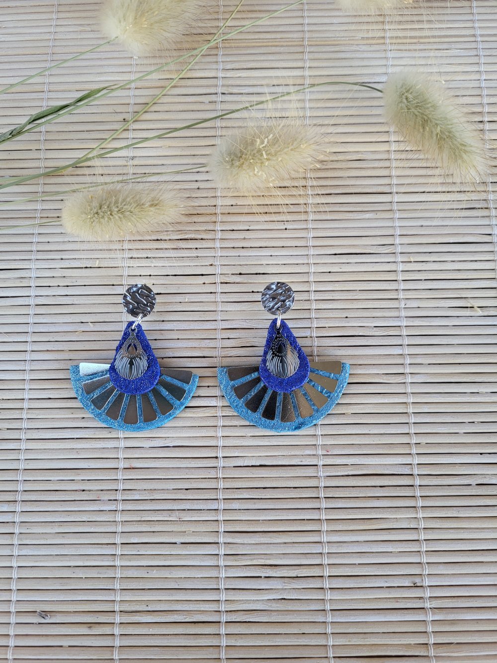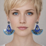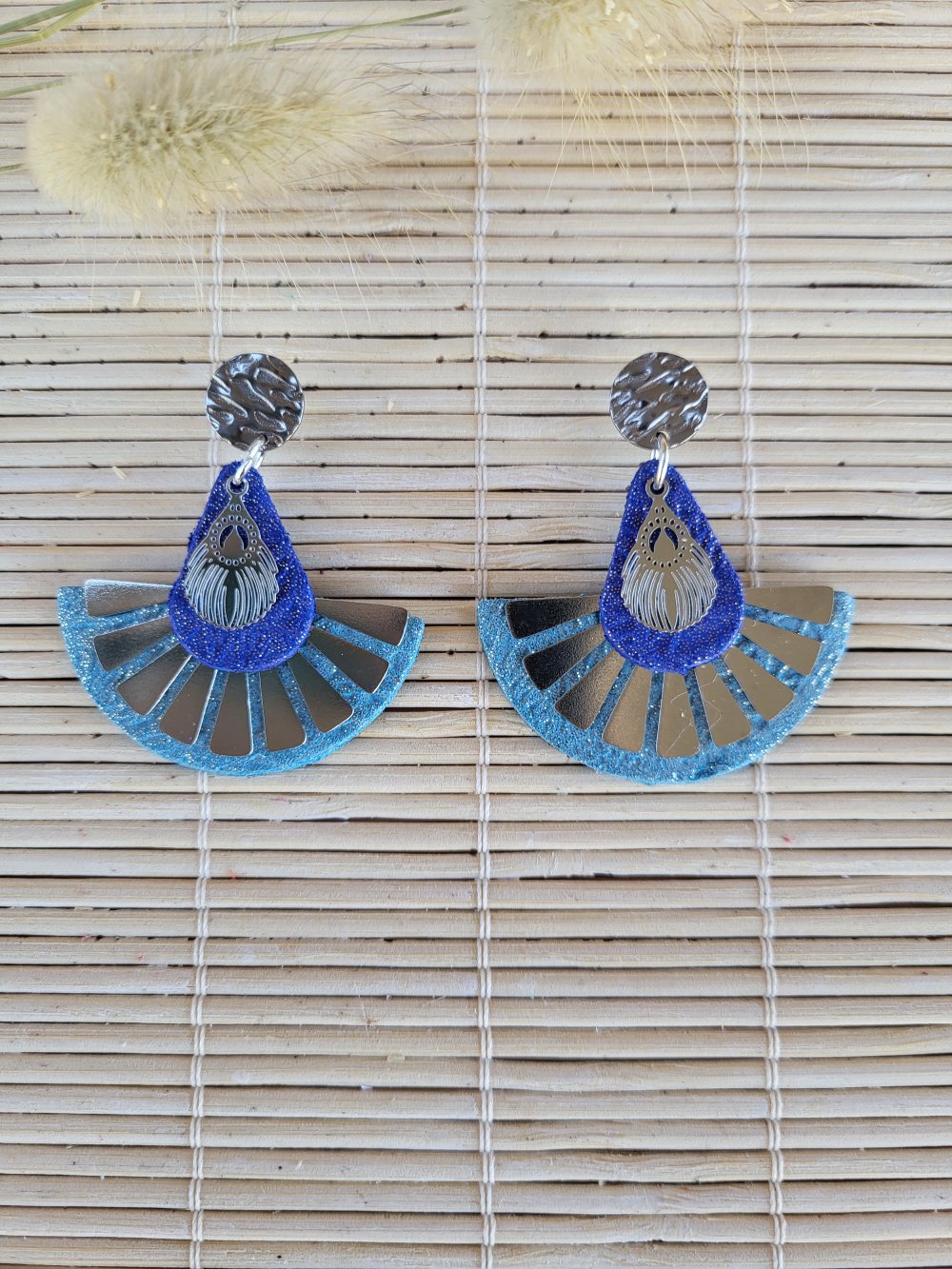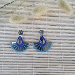 Boucles d'oreilles éventail en cuir bleu pailletée et de breloques plumes argenté.