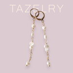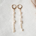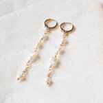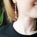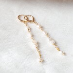 Ces longues boucles d'oreilles en perles sont si délicates et adorables. Plaquées or 14 carats, elles sont ornées de petites perles d'eau douce véritables de différentes formes. Légères et très jolies.