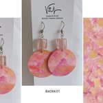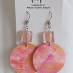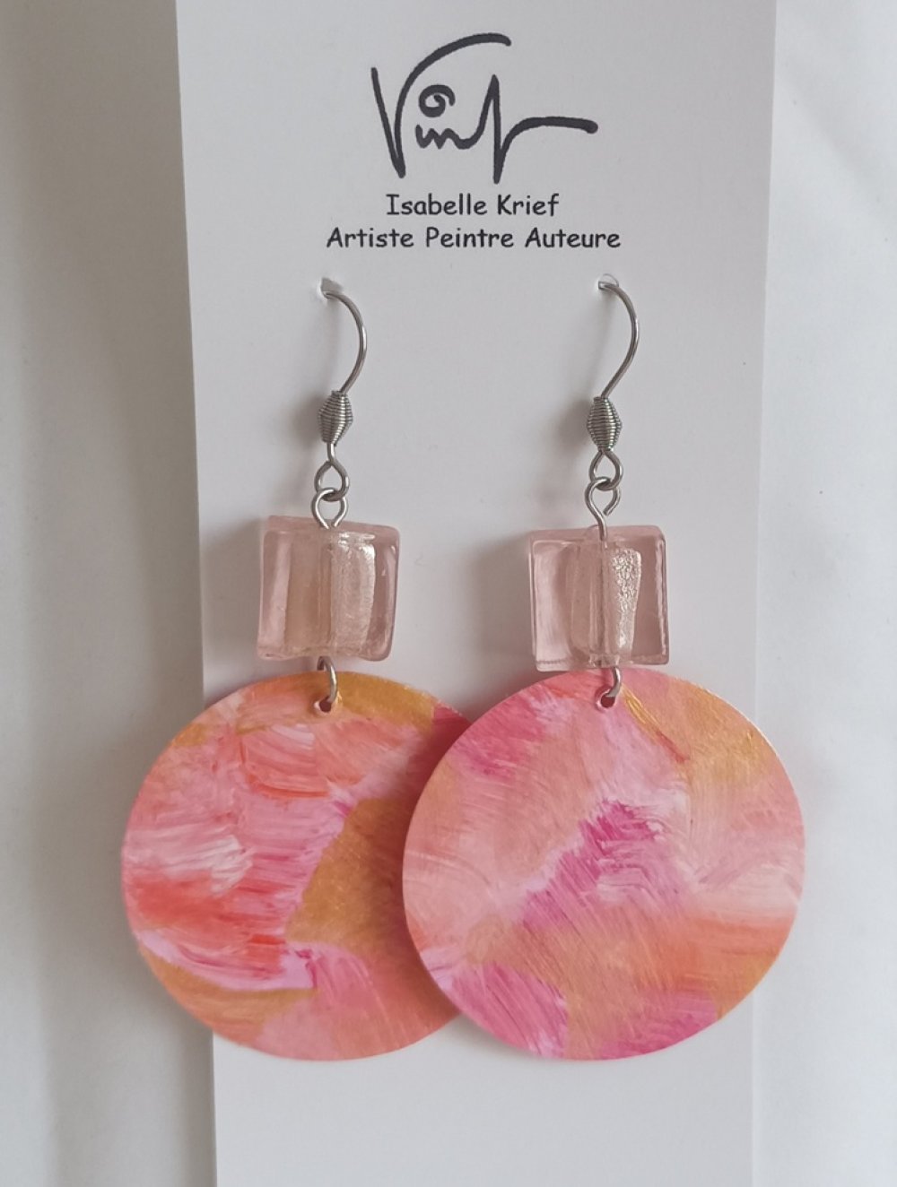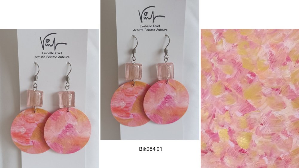 Bijou peint, boucles d'oreilles crochets acier chirurgical avec perles de verre carrées et pendentifs ronds, peinture acrylique, ton rose,art contemporain abstrait,cadeau fête anniversaire noël,fait mains en France,