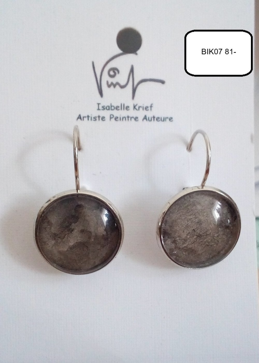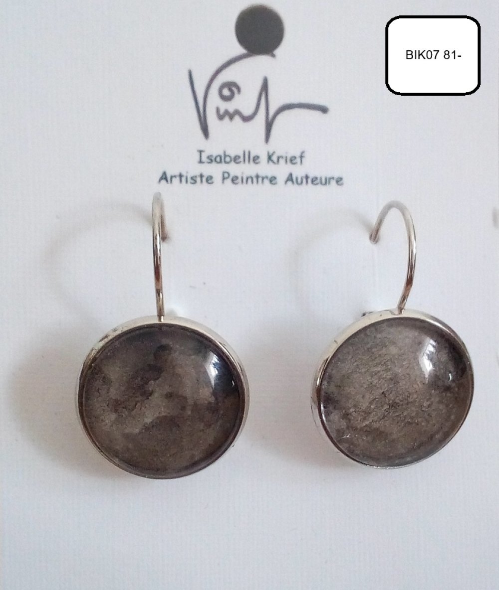 Boucles oreilles dormeuses argente rhodié avec cabochons ronds en verre, aquarelle gris noir, cadeau fete anniversaire noel,bijou peint,boutique de créateurs,narbonne occitanie,
