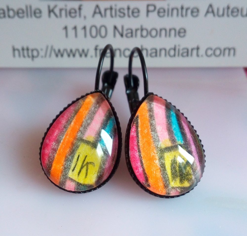 Boucles oreilles dormeuses gouttes noir avec cabochons aquarelle rose orange bleu jaune violet,cadeau fete anniversaire noel,