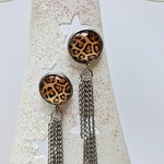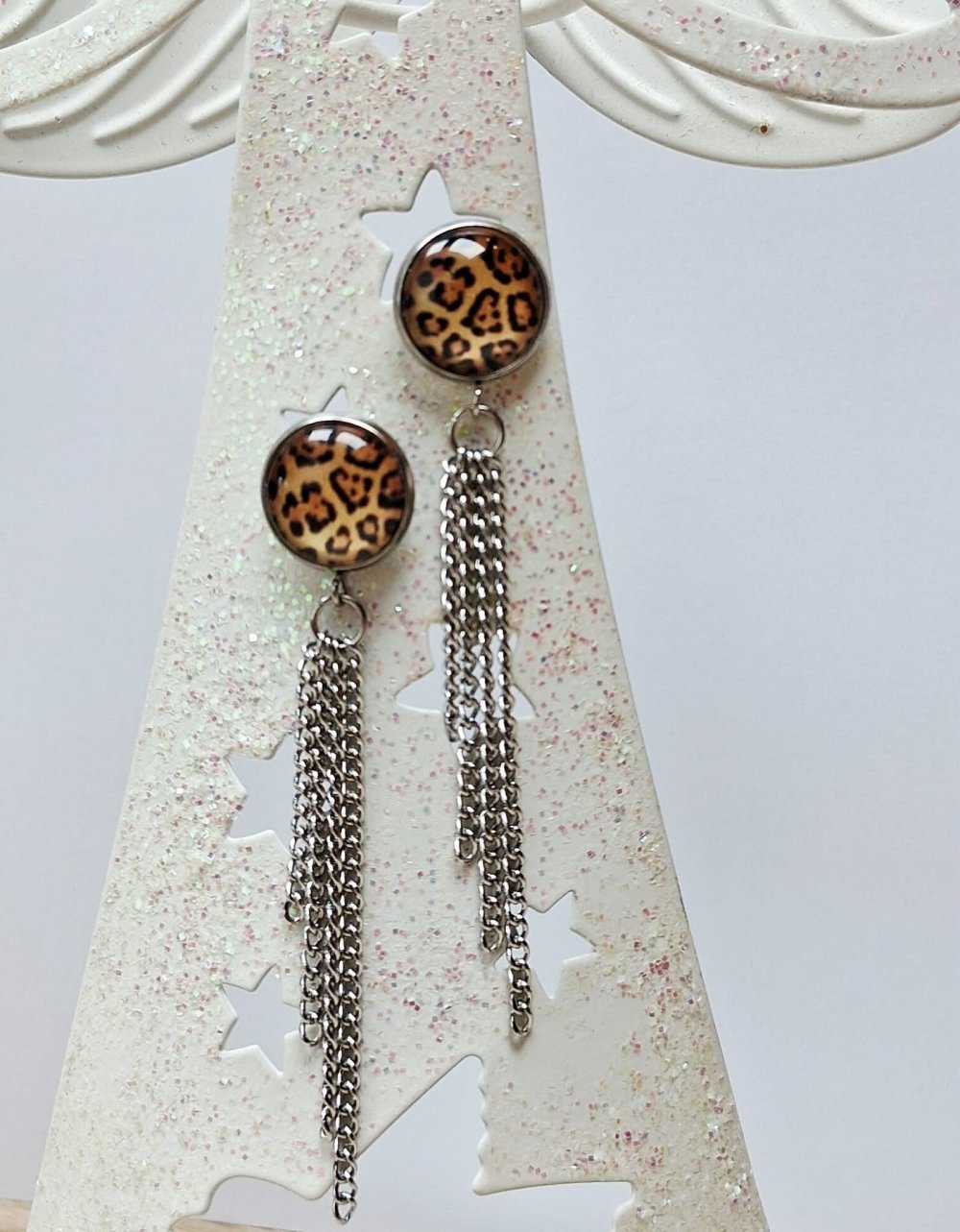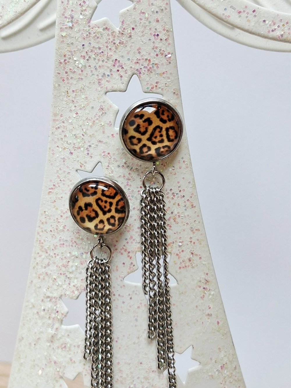 boucles pendantes argent en acier inoxydable et cabochons léopard