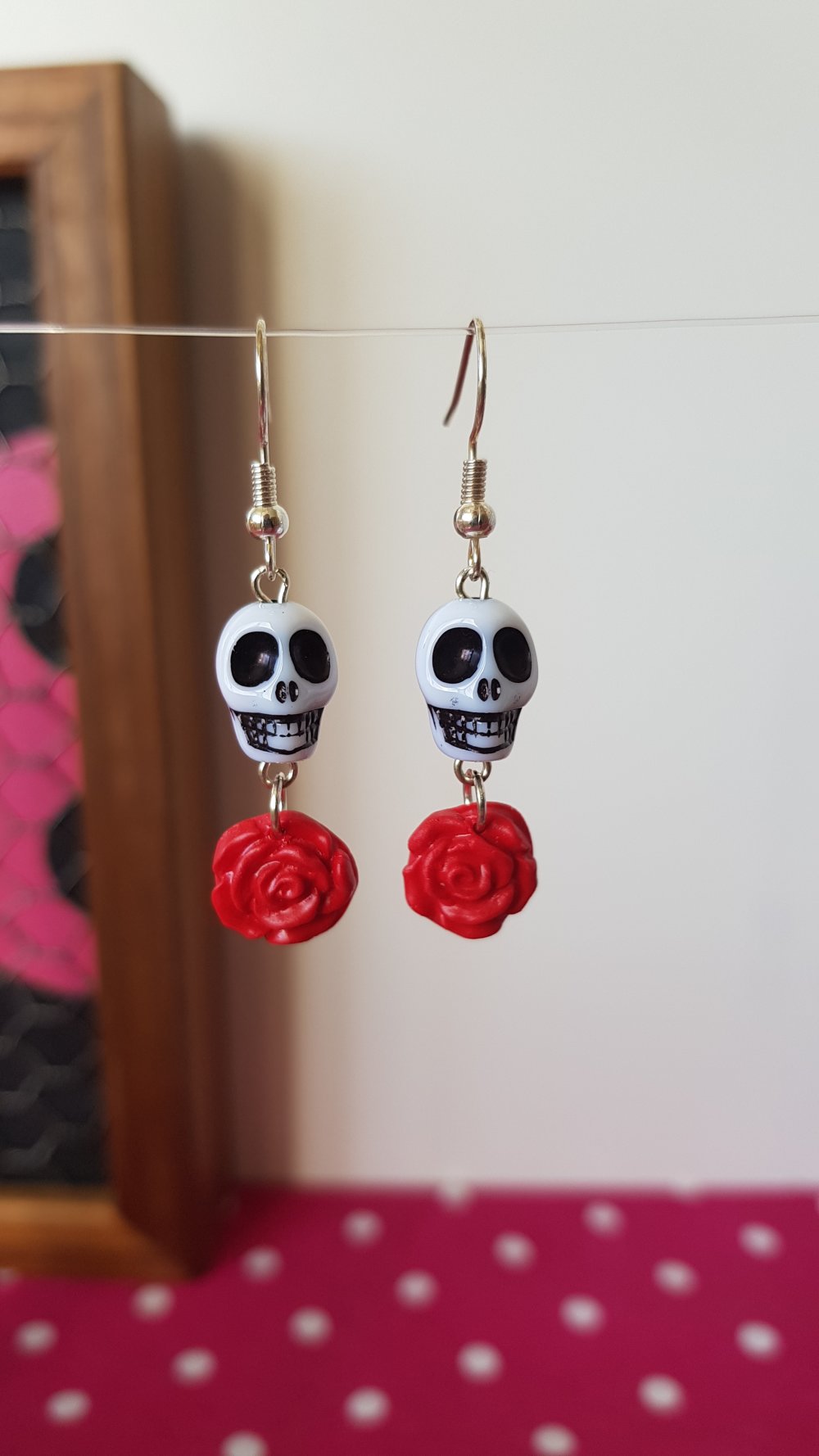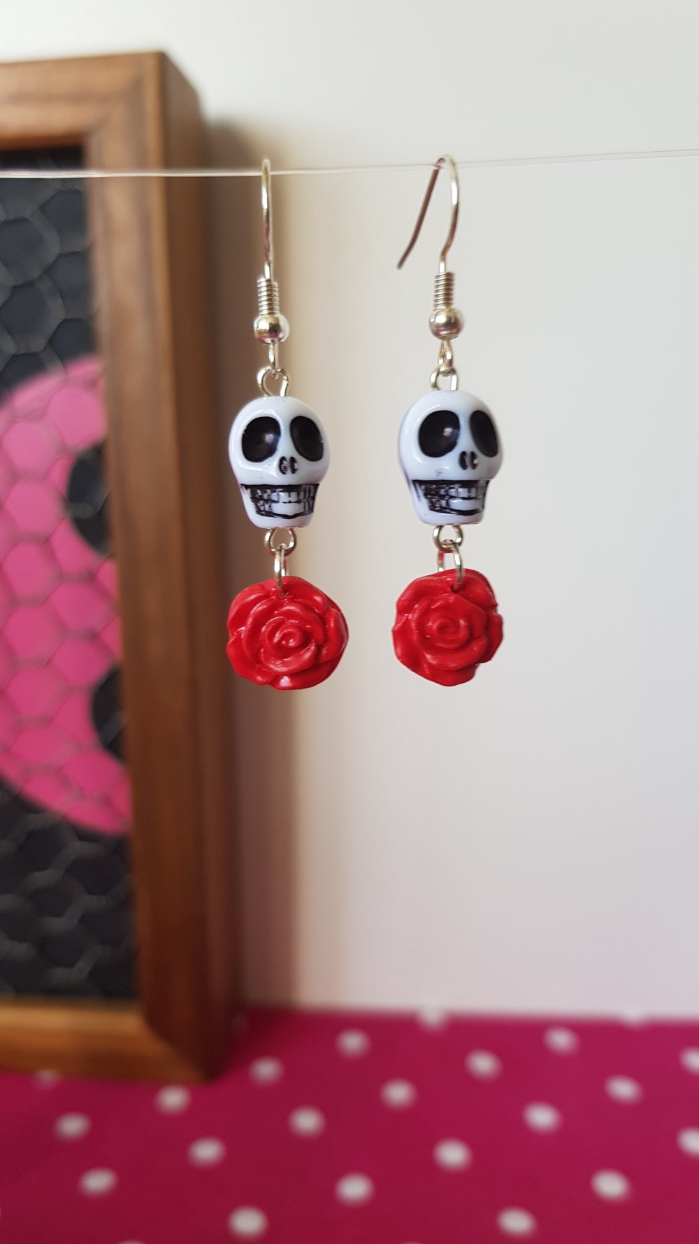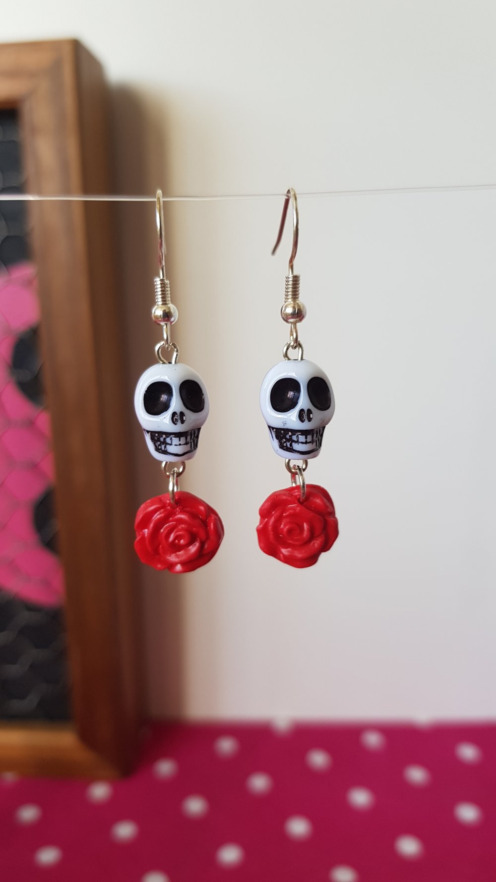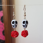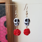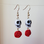 Jolies et originales boucles d'oreilles à l'esprit biker, hot rod, perle en forme de crâne blanc et d'une rose pendantes rouge, le modèle existe en noir 😉.