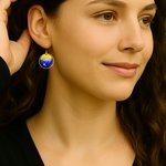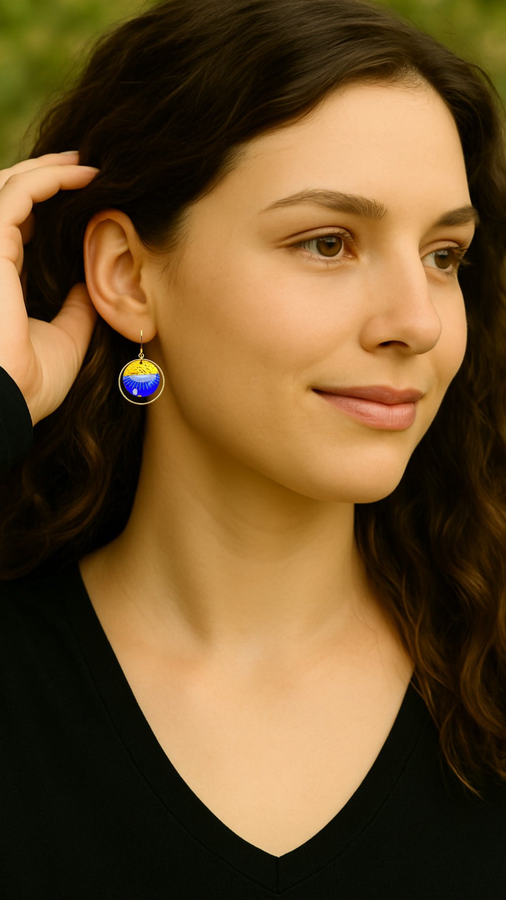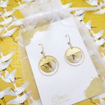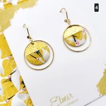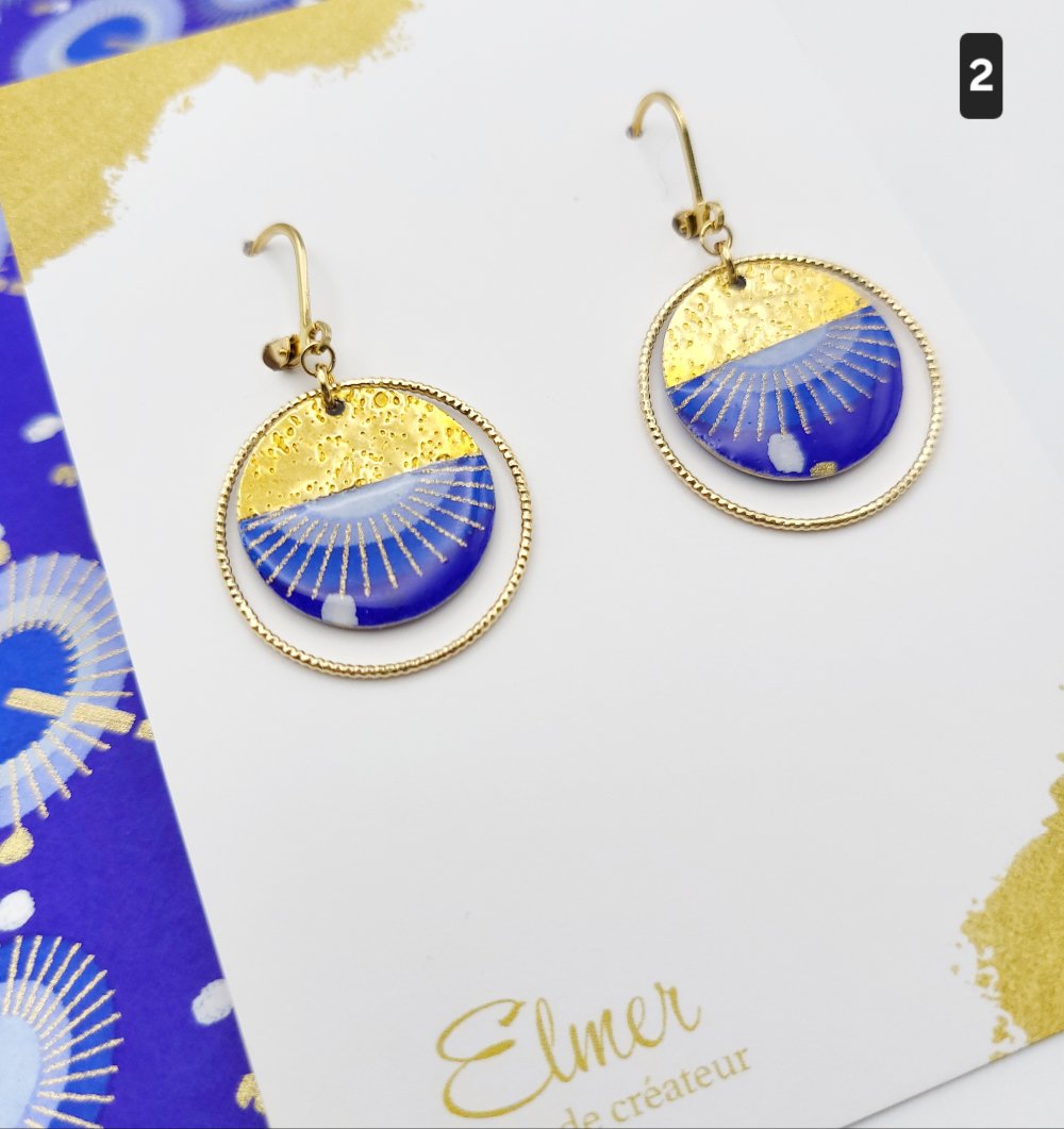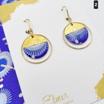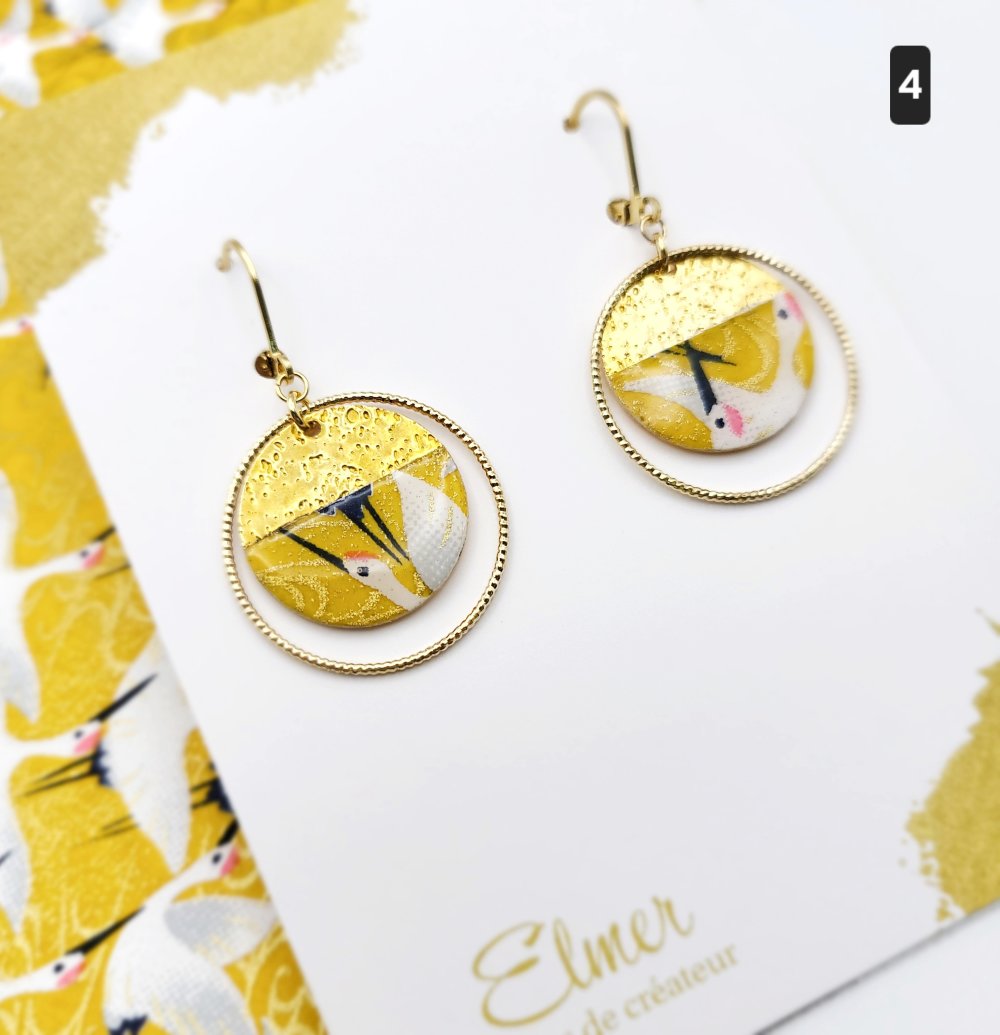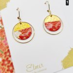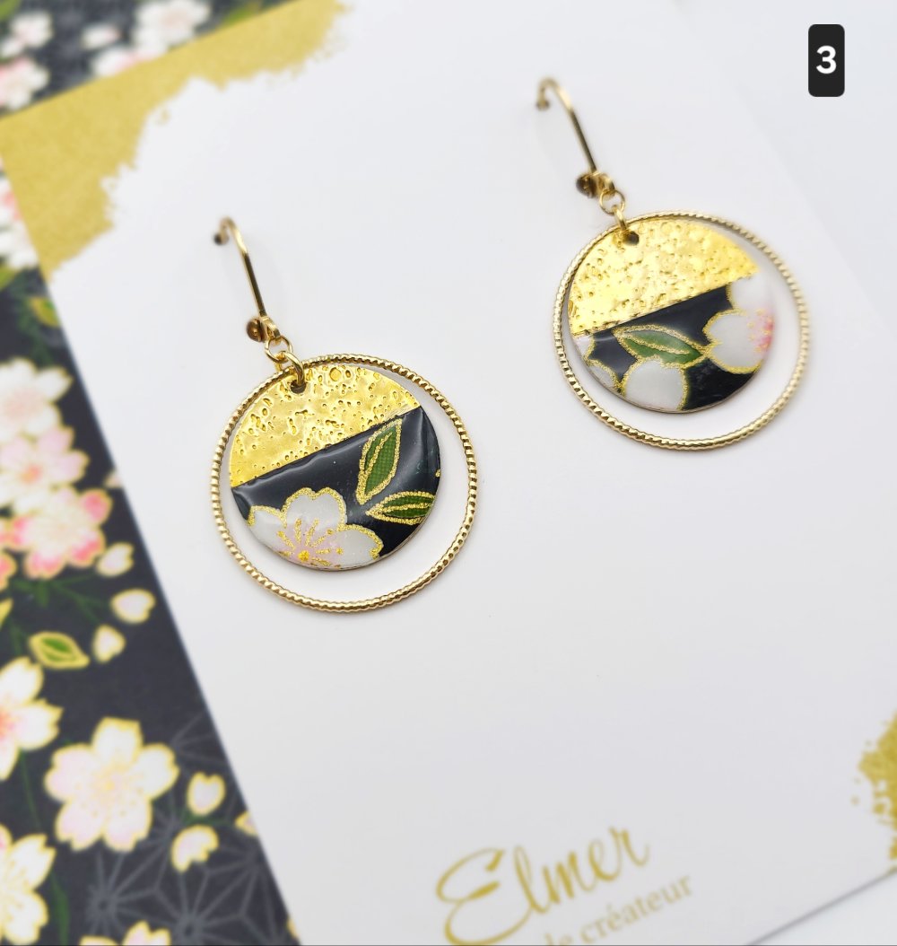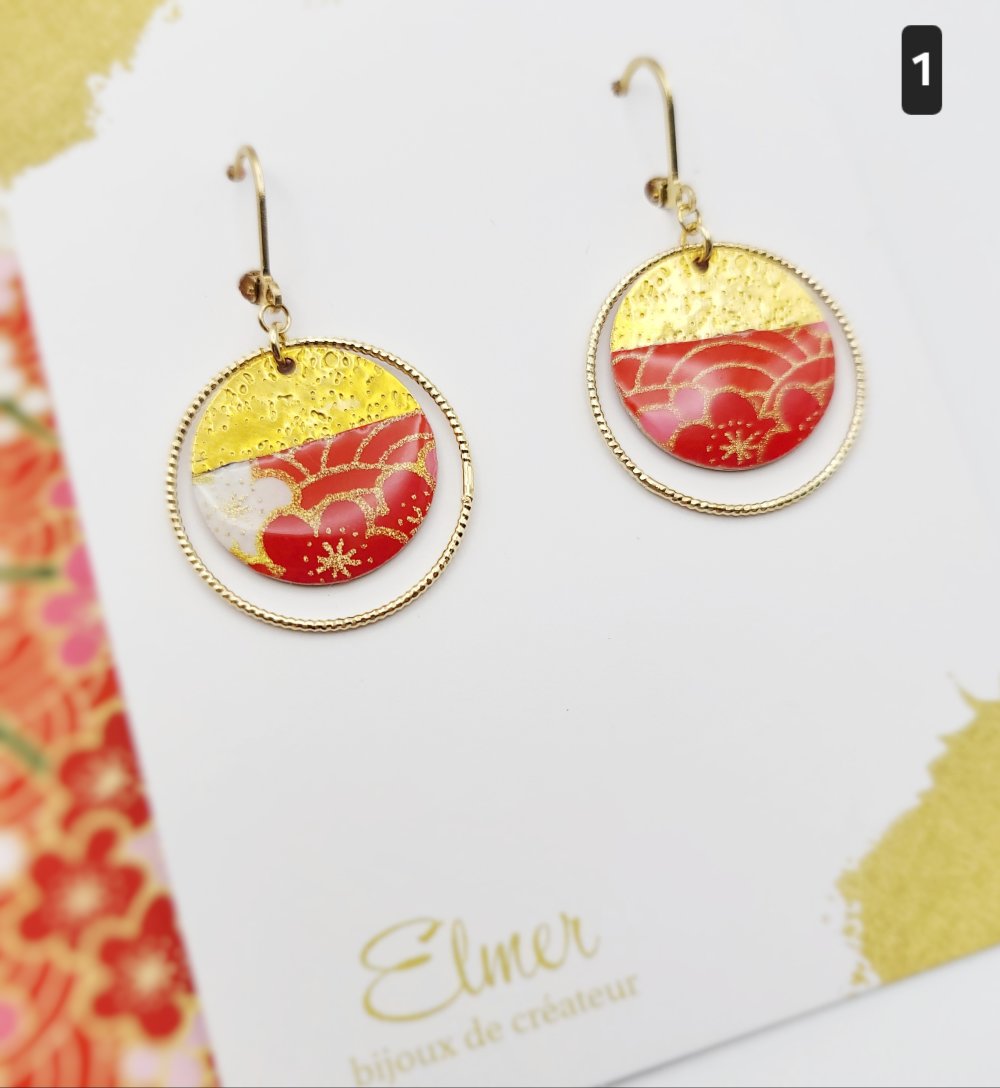 Pampille ronde moitié dorée martelée, moitié papier washi japonais sous fine résine, entourée d’un anneau doré ciselé — et émaux assortis au dos pour une finition impeccable.