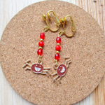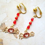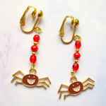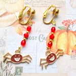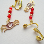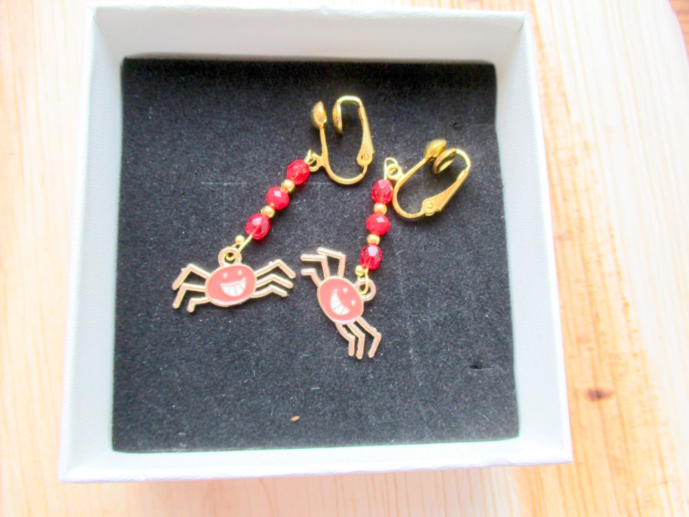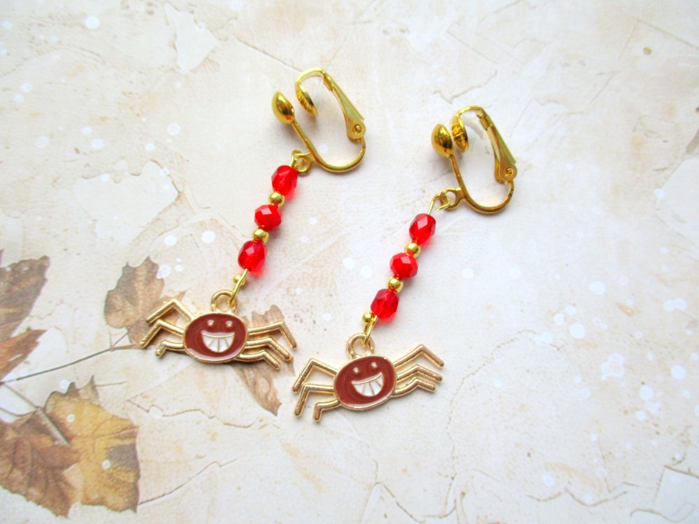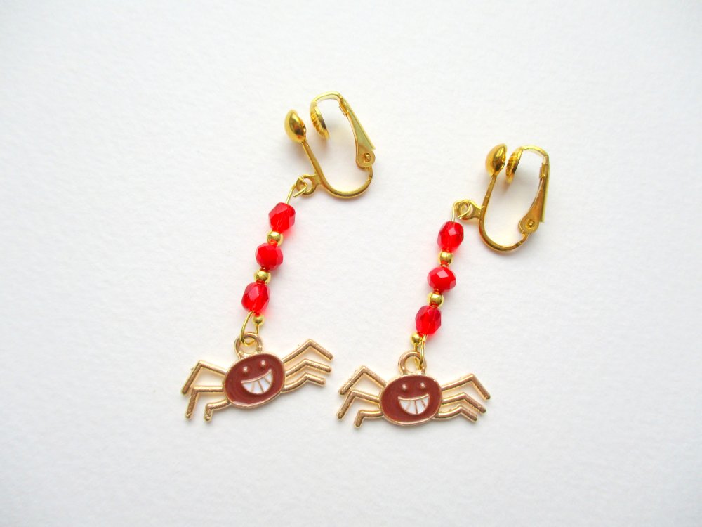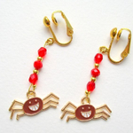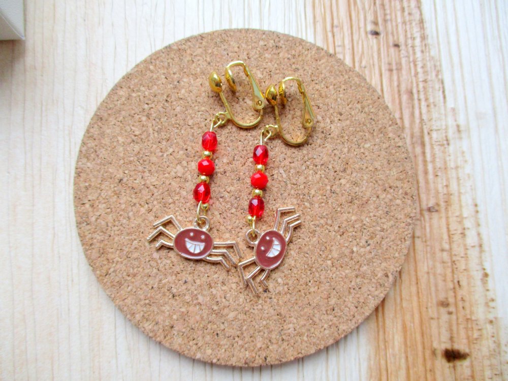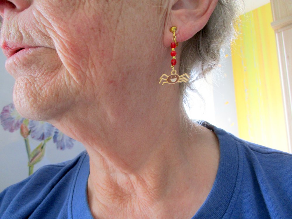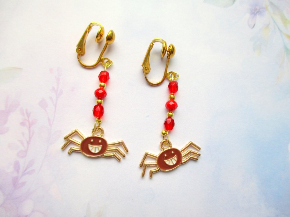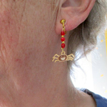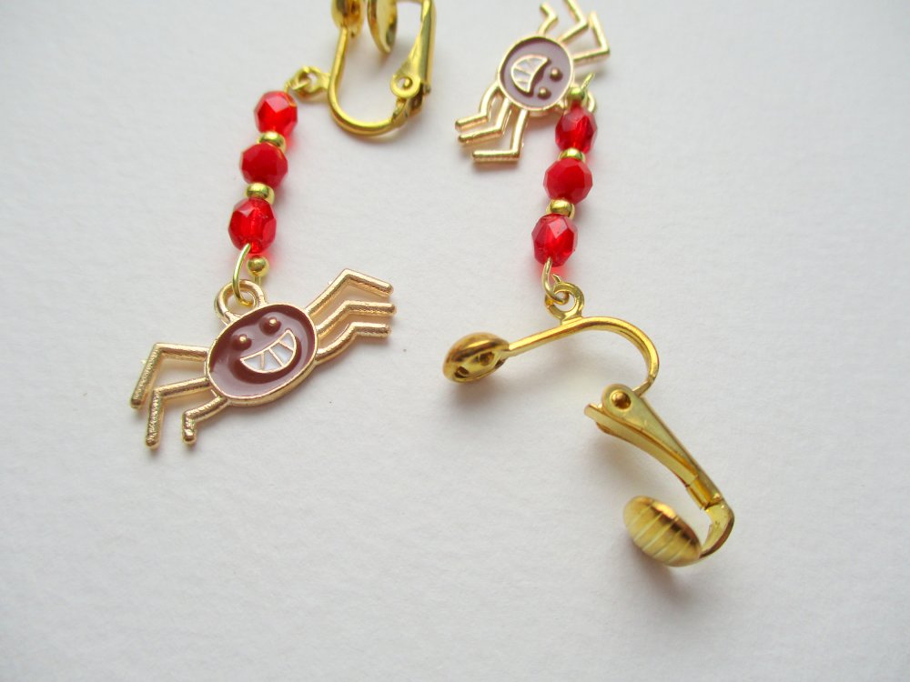 Trois petites perles en verre de couleur rouge séparées par des petites perles en métal doré soutiennent une araignée rouge et montrant les dents