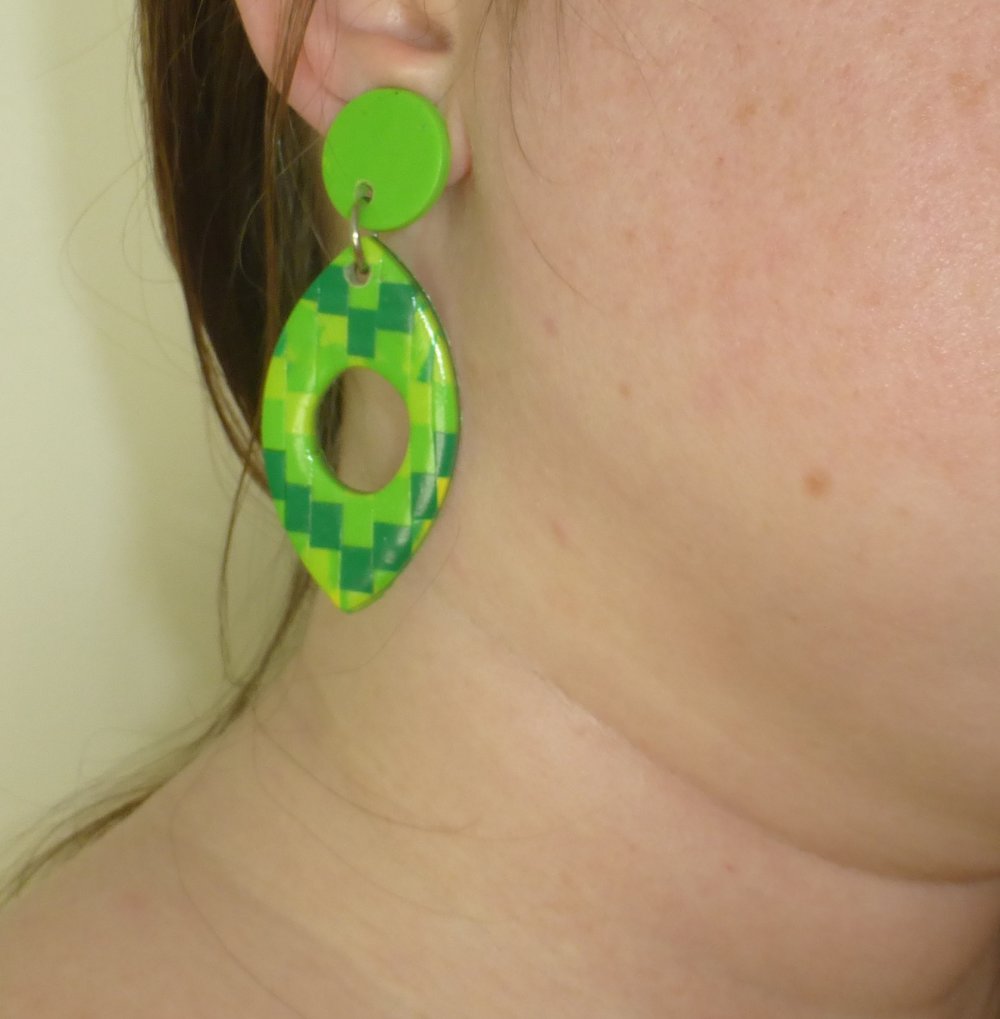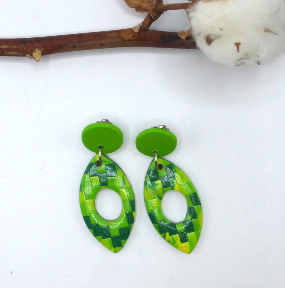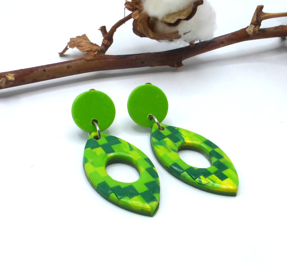 Clips boucles d'oreilles créoles navette carreaux bargello chevrons minecraft en pâte polymère et acier inoxydable, clips pendantes