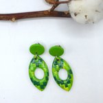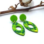 Ces clips d'oreilles à motifs géométriques verts en forme de créoles navette, très légères, sont fabriquées avec un cabochon en argile polymère collé sur un support à clip en acier inoxydable, auquel est assemblé des perles de pâte polymère.