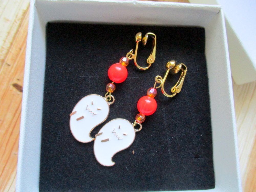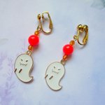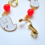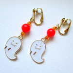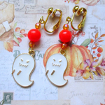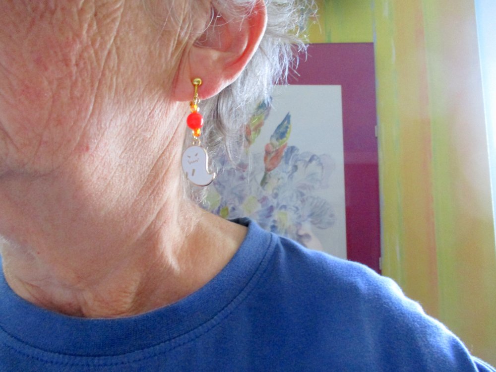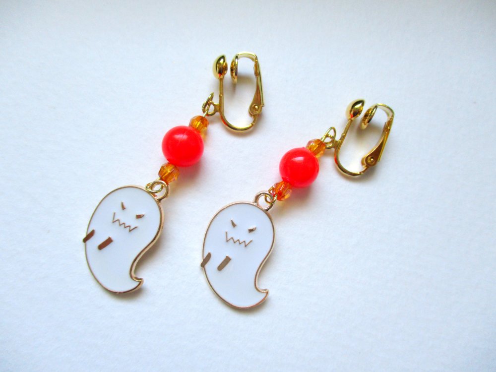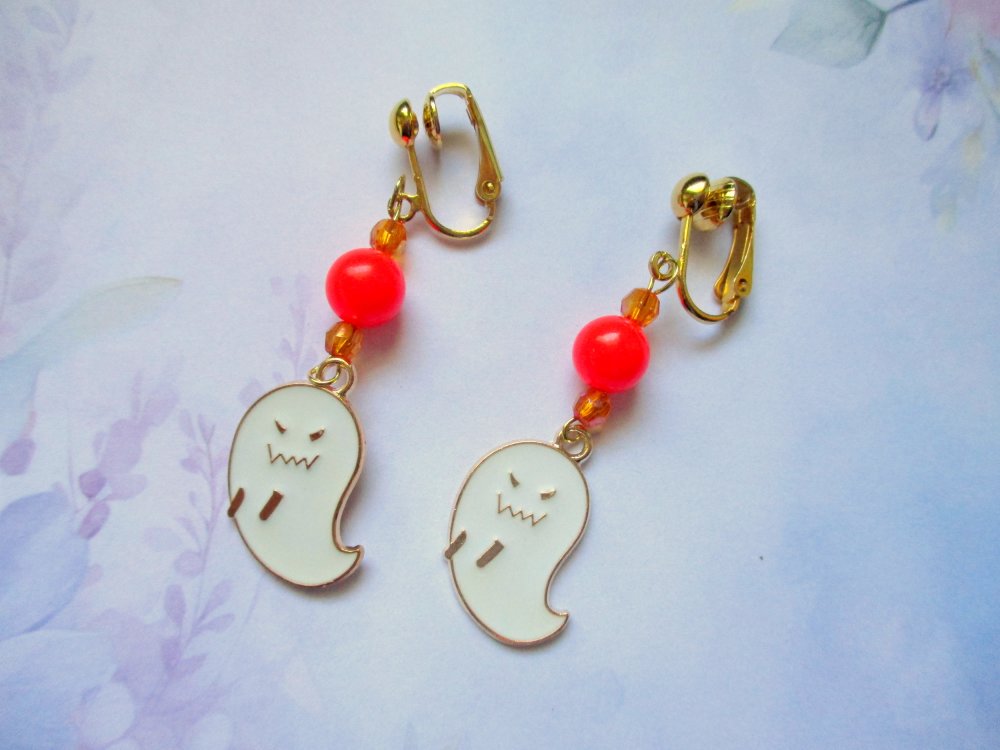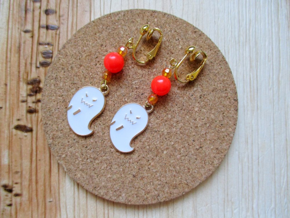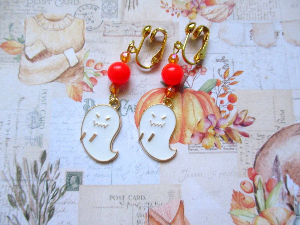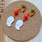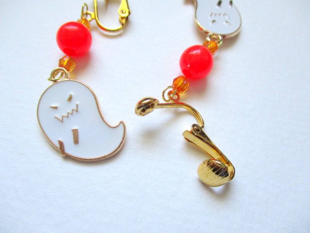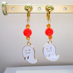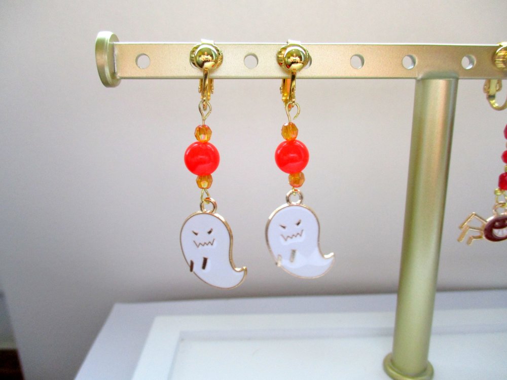 Un fantôme grincheux et terrifiant est suspendu à une perle plastique orange. Elle est entourée de deux petites perles en verre de couleur orange aussi