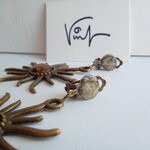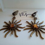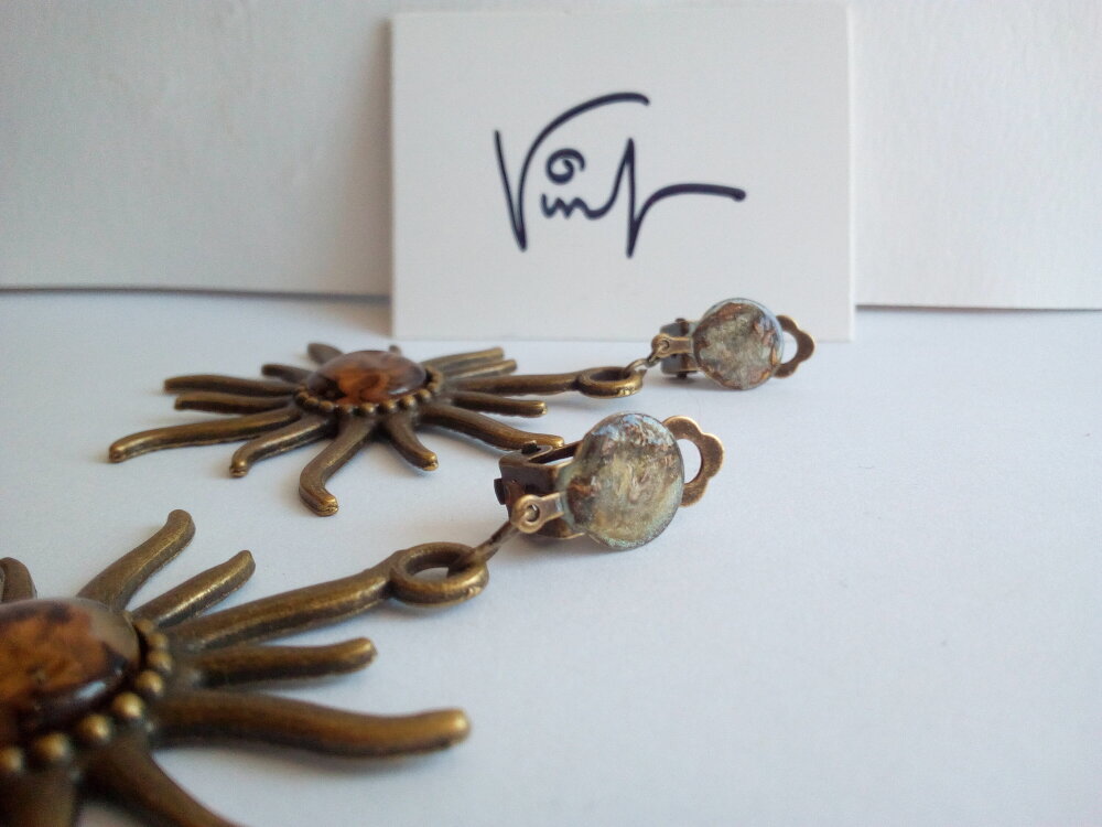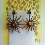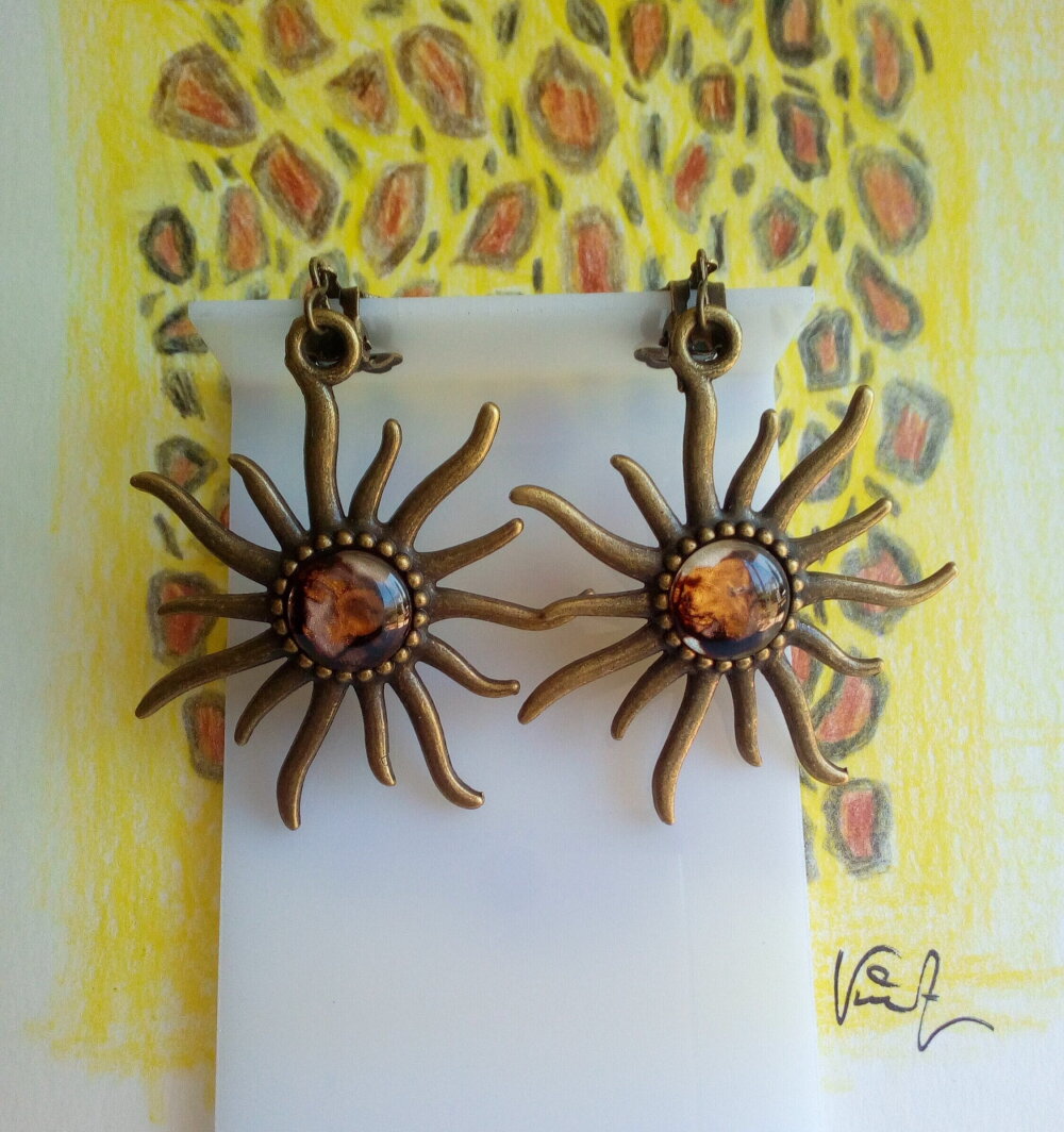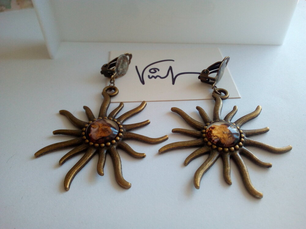 Clips oreilles non percees,soleil astre lumineux,cabochons ronds en verre peint par artiste francaise,or marron nacre blanc