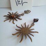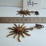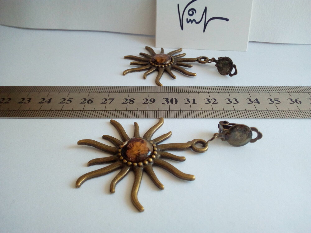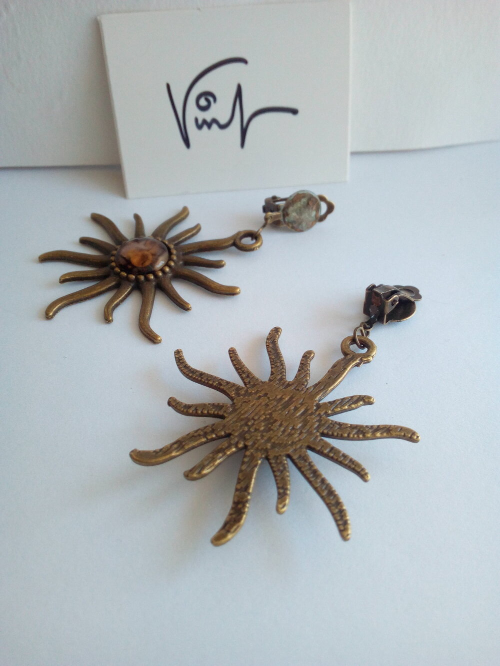 Clips oreilles non percees,grand soleil astre lumineux,cabochons ronds en verre peint par artiste francaise,or marron nacre blanc,