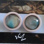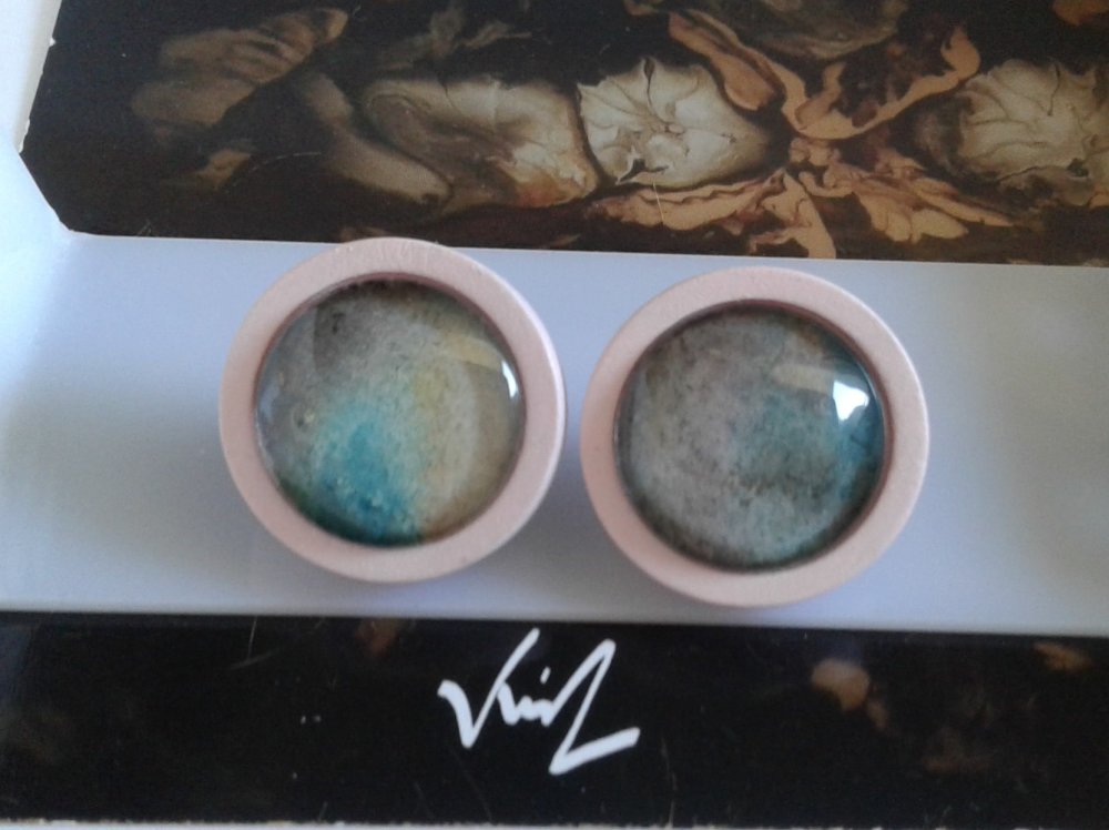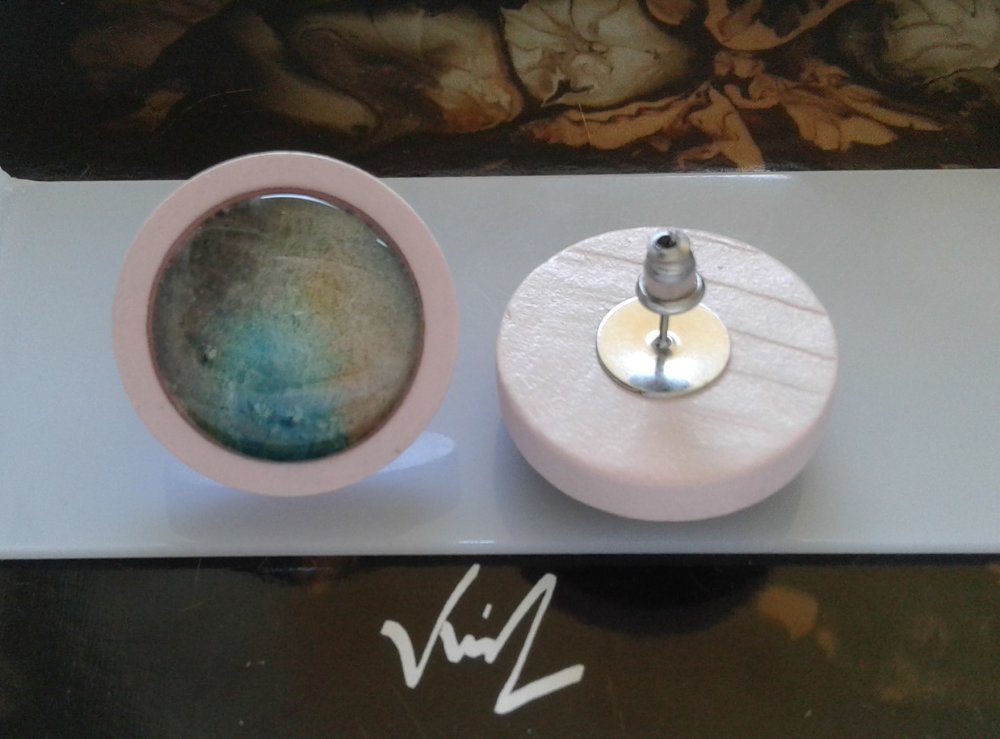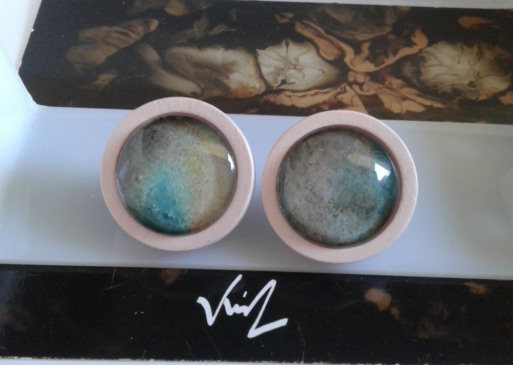 puces oreilles,clous oreilles,aquarelle originale,rose bleu noir gris,base bois acier inoxydable,cabochons ronds 20mm,peint artiste isabelle krief,fait mains en france,cadeau fete anniversaire,boho bobo gothique,art nouveau contemporain, punk fashion mode,