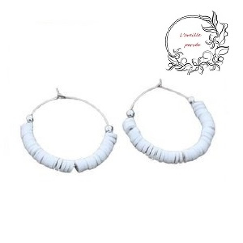 Boucle d'oreille réaliser avec des supports créoles en acier inoxydable, 2 perles rondes en métal et des rondelles couleur en fimo.