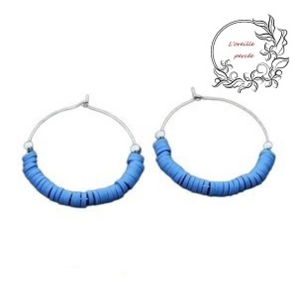 Boucle d'oreille réaliser avec des supports créoles en acier inoxydable, 2 perles rondes en métal et des rondelles couleur en fimo.